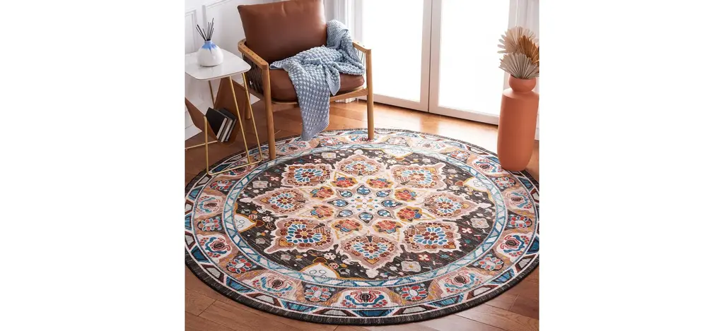 Antique rug artistry is reimagined in the brilliant hues, striking design, and any-room high performance of the Rella Round Area Rug. This trendy, transitional rug is machine washable, bringing high-style elegance to even the most well-traveled areas of the home. It is made using soft synthetic yarns with a foam latex backing for a comforting feel underfoot and long lasting charm.