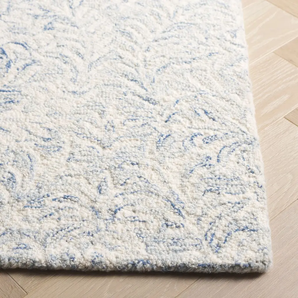Elevate your home decor with this elegant area rug, sized at 3 feet by 5 feet, perfect for adding a touch of sophistication to any room. The rug features a beautiful blend of blue and ivory hues, creating a serene ambiance. Its small rectangular shape and low profile height of 3/8 inch make it a versatile addition to your space. Crafted using the hand tufted technique, this rug boasts a wool pile that offers a soft and inviting texture underfoot. Originating from India, it embodies a traditional style with its intricate floral flower pattern, resonating a classic charm and timelessness. This rug effortlessly combines style and comfort, making it a delightful choice for any living area. Transform your interiors and create a welcoming atmosphere with this graceful decorative piece.