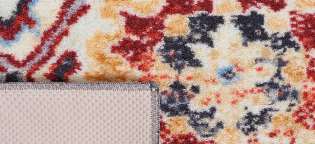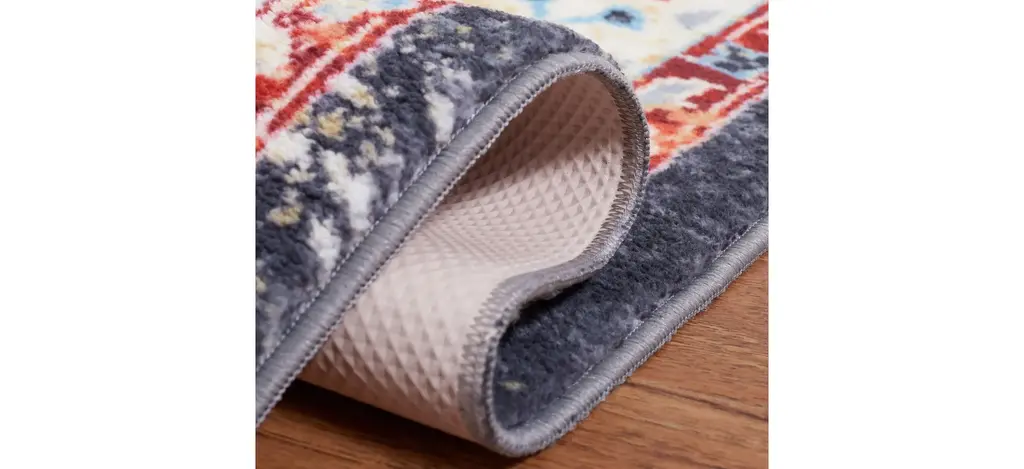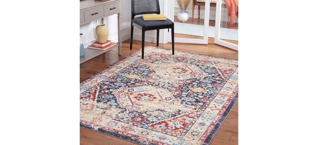 Antique rug artistry is reimagined in the brilliant hues, striking design, and any-room high performance of the Rensen Square Area Rug. This trendy, transitional rug is machine washable, bringing high-style elegance to even the most well-traveled areas of the home. It is made using soft synthetic yarns with a foam latex backing for a comforting feel underfoot and long lasting charm.