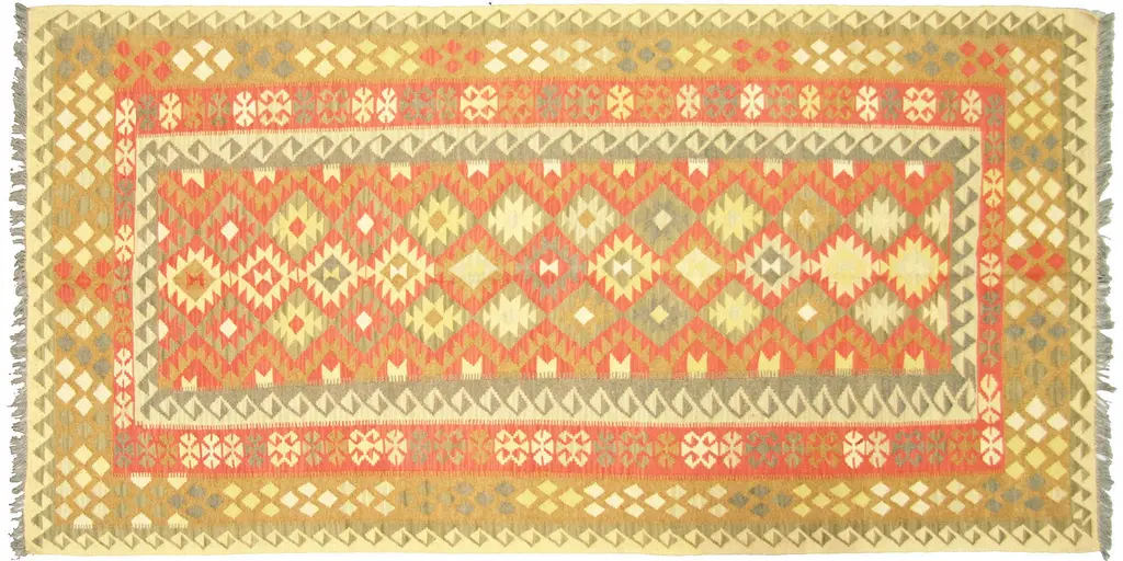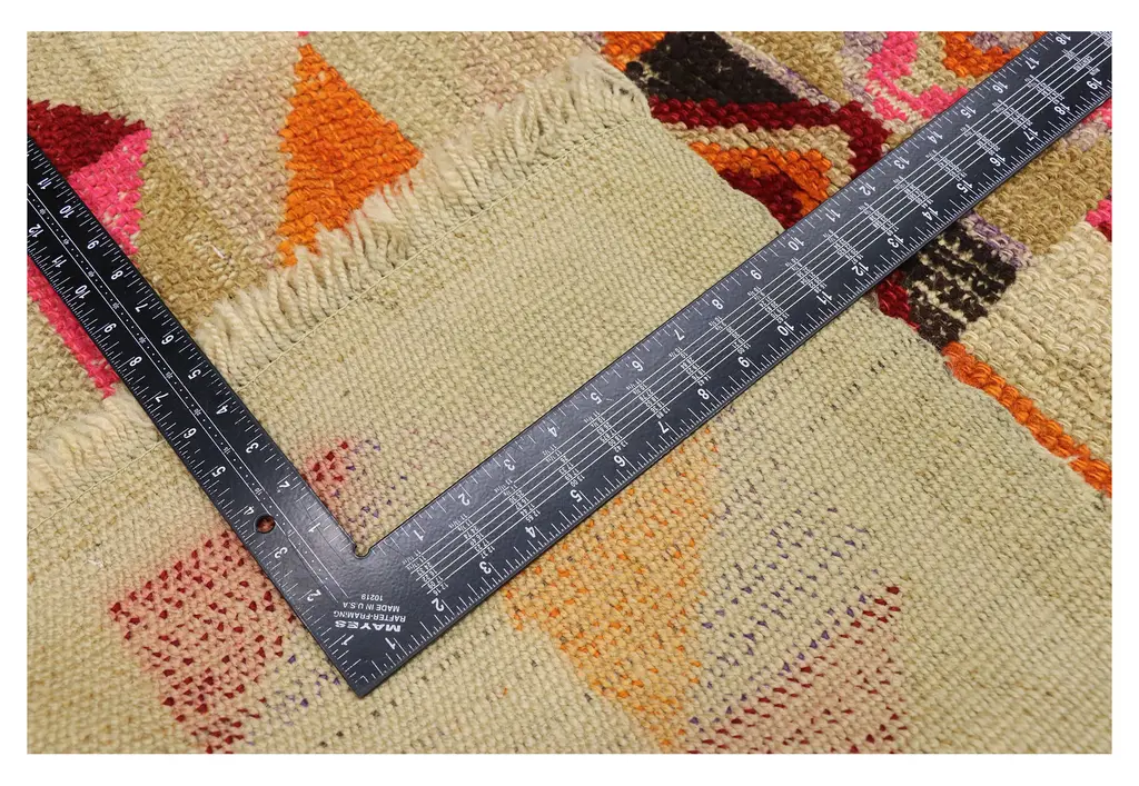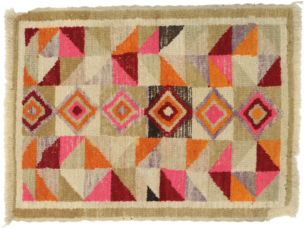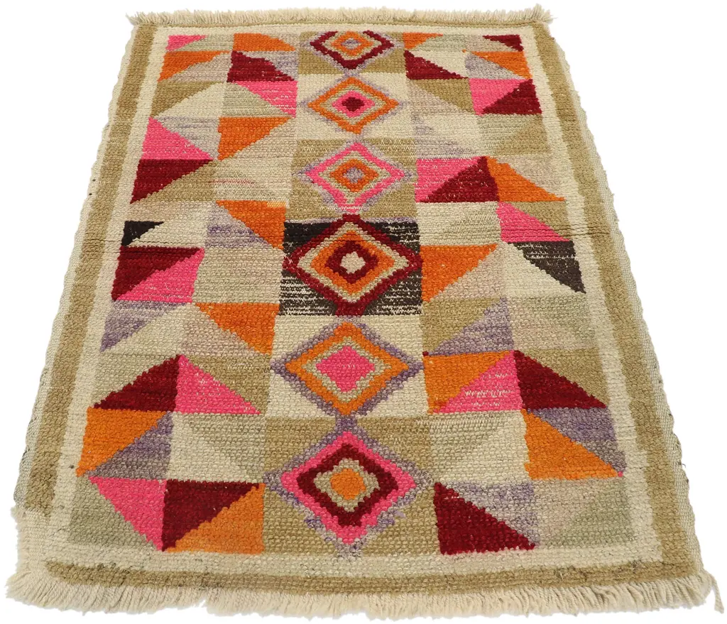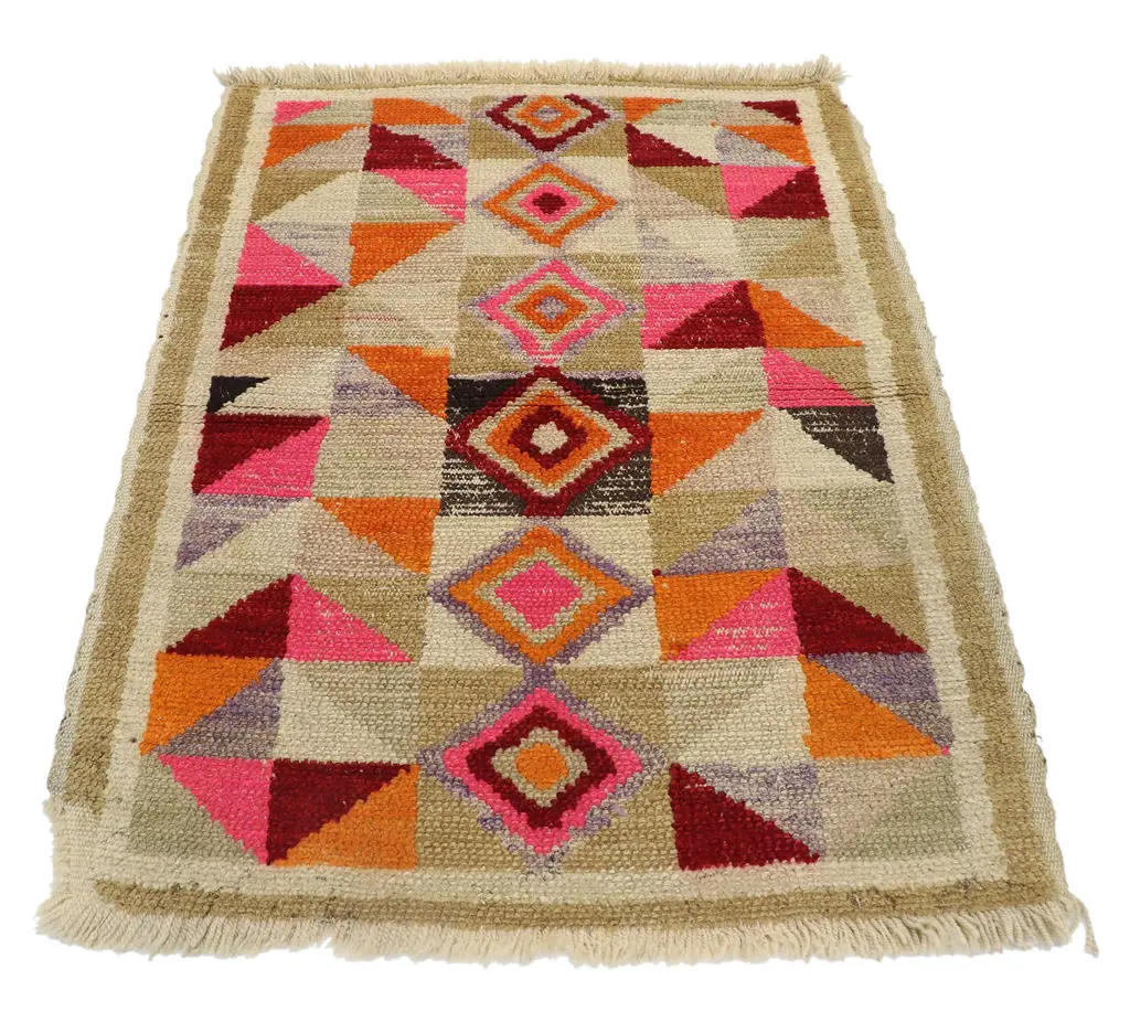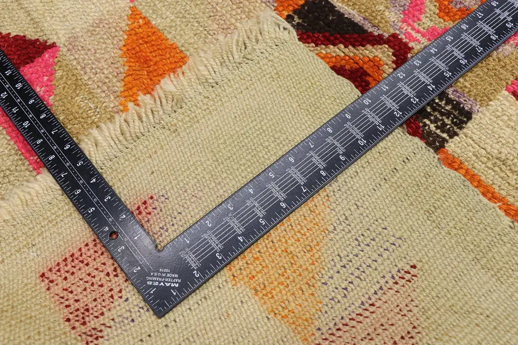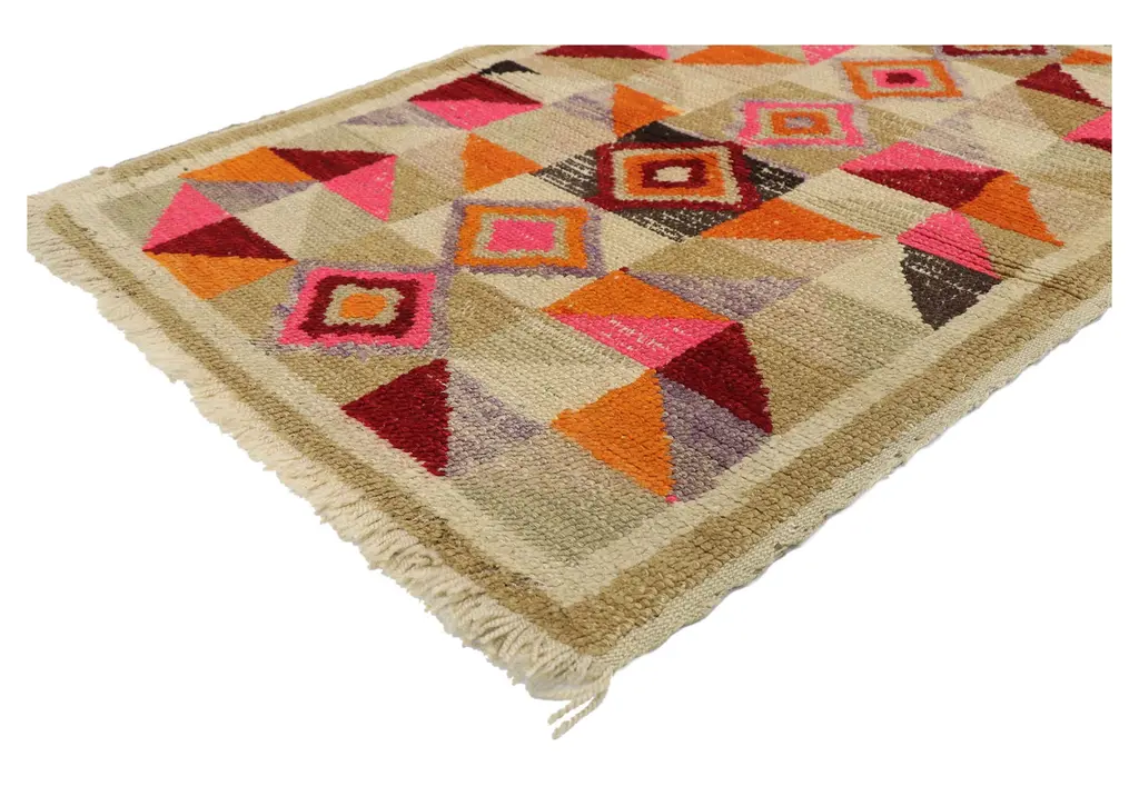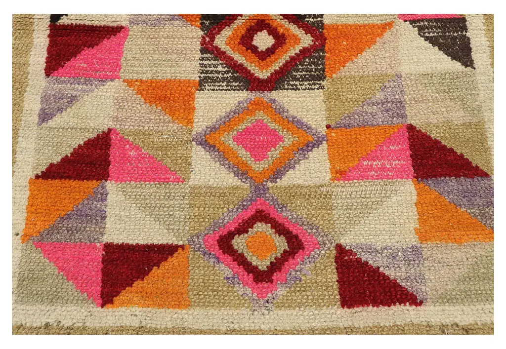 Cubism collides with Postmodern style in this hand knotted wool vintage Turkish rug. The cubist design and vibrant colors woven into this piece work together creating a truly unique look. The abrashed field features concentric lozenges running down the center and surrounded by an all-over geometric pattern composed of triangles. Packed with visual complexity, the neutral tones and bold colors create an esoteric juxtaposition among the geometric design.