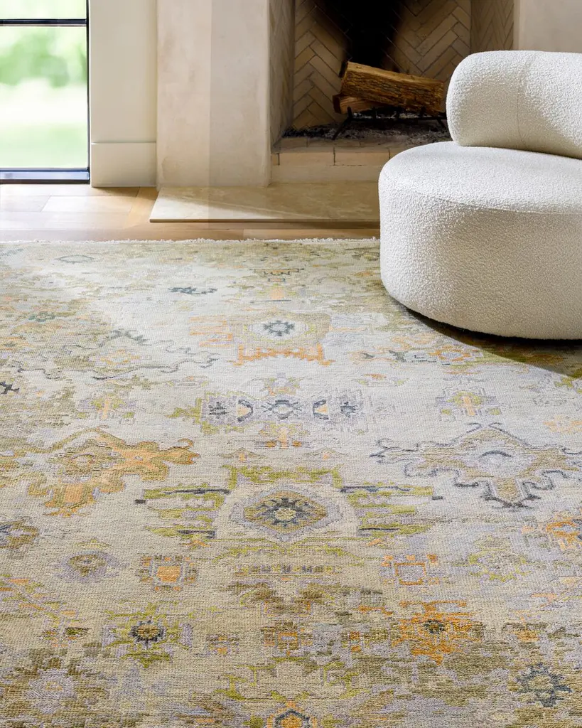 This low-pile rug feels as luxurious as it looks. It was hand-knotted primarily of New Zealand wool, prized for its softness and durability, with silk added for subtle luster. A rug pad is recommended to help prevent slipping and extend the life of the rug.
