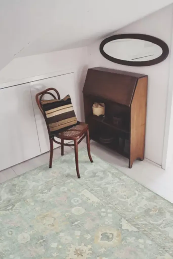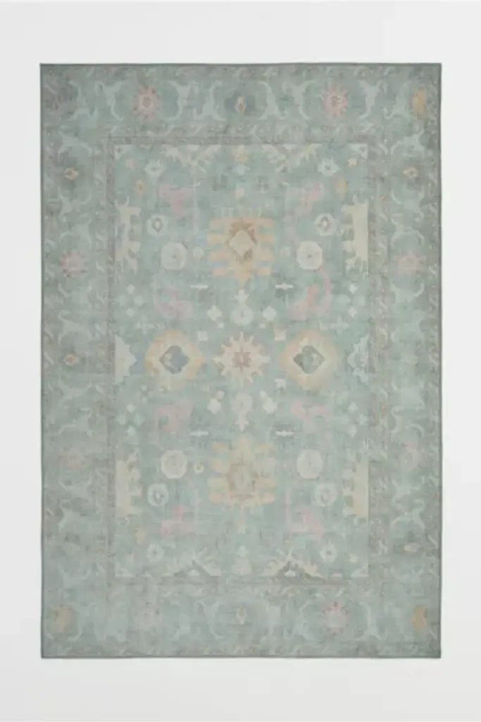 A soft, no-shed, stain-resistant rug, Nimbus draws inspiration from traditional floral rugs and the spacious, almost mystical composition of certain Oushak designs. It features a ground of puffy amoeba floating in a garden. Soft as wool with a subtle silk-like sheen, polyester is highly durable, OEKO-TEX certified for safety, mildew-resistant, and extremely easy to clean. A recycled cotton and mixed-fiber backing is transformed from collected clothing and other discarded textiles and repurposed into a sturdy, flexible backing material. **Content + Care** \- Power-loomed low pile: about .15" thick (4-5mm) \- 100% polyester on recycled mixed-fiber backing, OEKO-TEX certified \- Slight variations in size to be expected \- Vacuum on low power with a non-rotary (no spinning brush) vacuum \- Rug pad recommended \- In case of spills, spot clean with unscented citrus-free clear soap \- Imported **Size + Fit** \- S - 5' x 8' \- M - 6'3" x 9'2" \- L - 8'2" x 10'2" \- XL - 10' x 13'1" \- XS/S - 2'7" x 9'2"