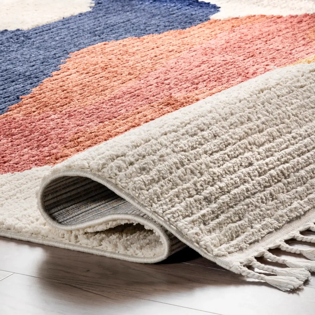 A floor covering this unique stuns anyone who lays their eyes on it! A pattern unlike any other, this area rug combines bold colors and unique, playful shapes. Pair with simple, delicate decor and let the beauty of this piece speak for itself. Tassels around the edge add a breezy, airy element. Kick those feet up and get ready to relax with our pet-friendly and easy to clean area rugs.