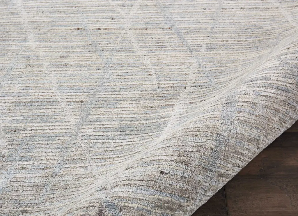 Explore the depths of the Ocean Collection with this luminous, hand knotted area rug. Delicate lines of slender crosshatching add graphic interest and a contemporary slant to its sensual waves of ribbed texture. Surf's up in soft tones of seafoam green, awash with an interplay of shadow and light. Slight variations in color from product to product are natural characteristics of high quality handcrafted home decor. Your product may not exactly match what is pictured on this page. Due to the detailed construction of our rugs, both handmade and machine made, sizes may vary.