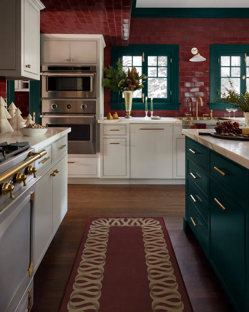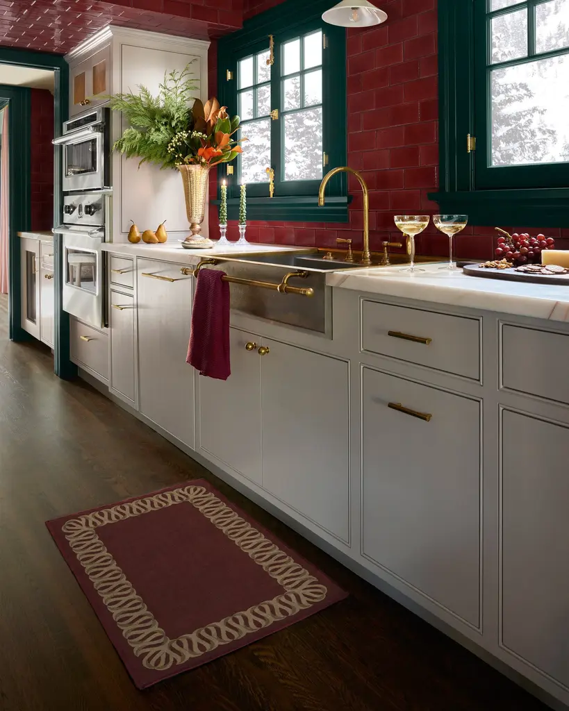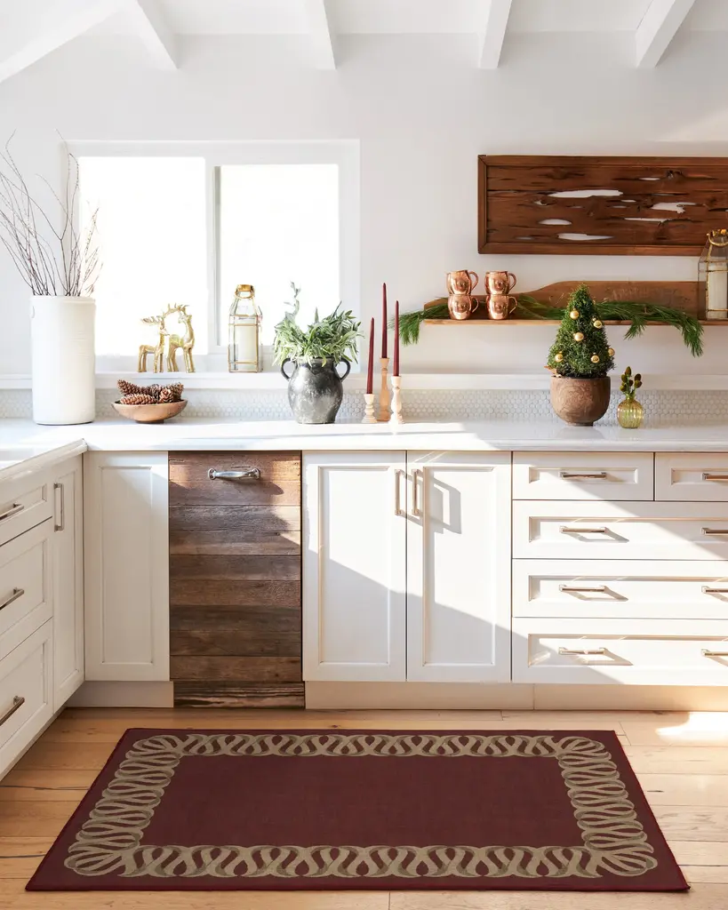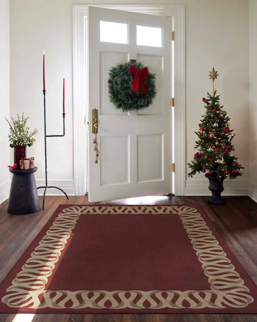 Add elegant holiday flair to your home with our Ribbon Border Red & Natural Rug. This seasonal design features a decorative, natural cream ribbon border against a bold red background. Water-resistant, stain-resistant, and machine-washable. Rug colors may vary slightly according to your device and the lighting in your space.