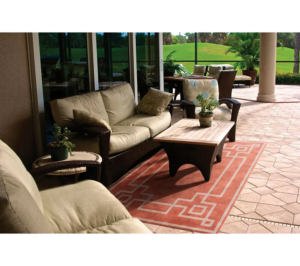 This durable, polypropylene rug has an Eastern-inspired geometric design on a rich, red ground.