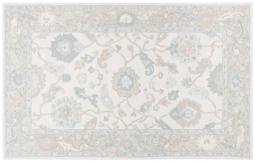 Introducing our exquisite area rug, designed to enrich your living space with elegance and warmth. This 4'0" x 6'0" small rectangular rug features a light grey and ivory palette, creating a serene and inviting atmosphere. Hand-tufted in India, its traditional style and oriental pattern bring timeless charm to your decor. Crafted with a wool pile, it offers a gentle and natural texture underfoot. With a height of three-eighths of an inch, it elegantly complements any room without overwhelming the space. Discover the perfect blend of artistry and comfort with this beautiful addition to your home.