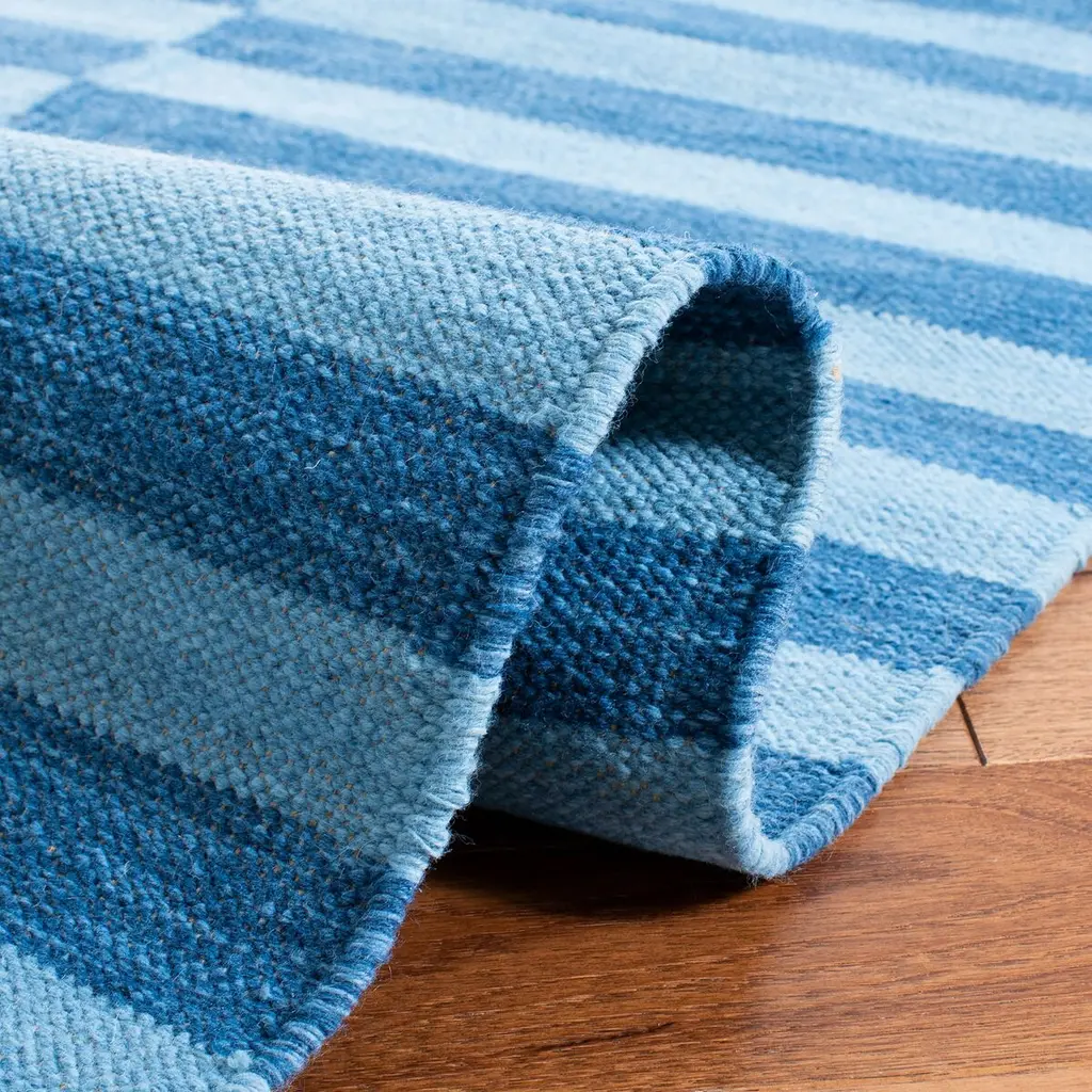 Introducing our Horizon Collection area rug, a serene and stylish addition to any space. This 4' x 6' small rectangle rug features a tranquil striped pattern, capturing the essence of calm seas and clear skies with its gradient of blue hues. The low-profile 1/8" height is perfect for seamless placement in any room, ensuring doors can swing over it easily and feet won't catch. Each strand of this hand-woven masterpiece is meticulously crafted from durable polyester, guaranteeing a soft texture underfoot and long-lasting resilience to daily wear. Constructed with unparalleled attention to detail, this rug echoes the ancient traditions of Indian rug making, bringing a piece of artistic heritage into your home. Whether you're creating a coastal retreat, a minimalist sanctuary, or a contemporary living area, this Horizon area rug is a versatile choice that complements a wide range of interior decors. Its soothing pattern adds a touch of elegance while providing the practicality you seek in a high-traffic area. Reflecting the beauty of the sky at dawn or dusk, it is sure to become a cherished element of your decor scheme.
