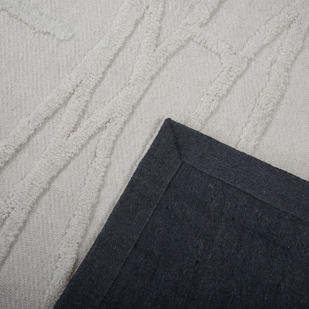 Collection: Bixby Colors: Ivory Construction: Hand Tufted Material: Face: 100% Wool Pile: Medium Pile Pile Height: 0.3" Styles: Contemporary Backing: Canvas Made In: India Price Range: $$$$$ (Affordable)