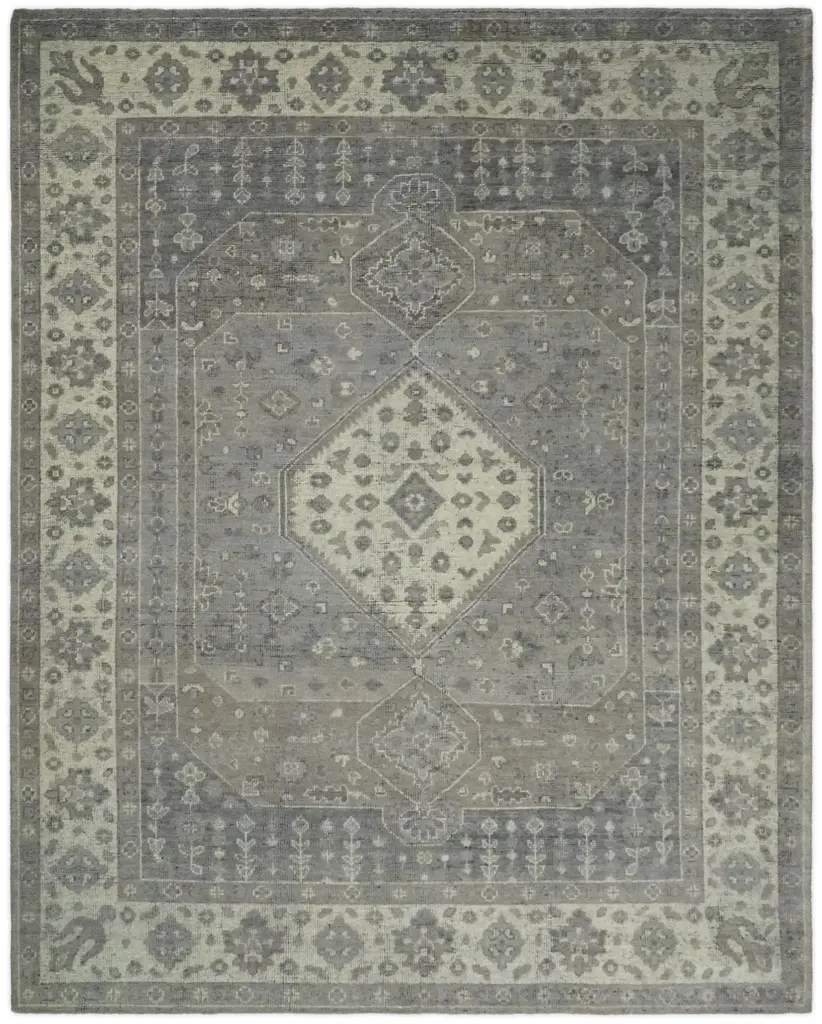 Collection: Centra Colors: Gray, Light Gray, Medium Gray, Beige, Ivory Construction: Hand knotted Material: Face: 100% Hand Spun Wool Pile: Medium Pile Pile Height: 0.3" Styles: Traditional Made In: India Price Range: $$$$$ (Premium)