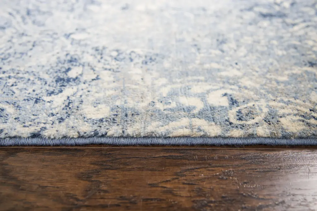 Collection: Gossamer Colors: Blue, Light Blue, Ivory Construction: Machine Woven Material: Face: 100% New Zealand Wool Pile: High Pile Pile Height: 0.6" Styles: Transitional Backing: Polyester Made In: India Price Range: $$$$$ (Premium)