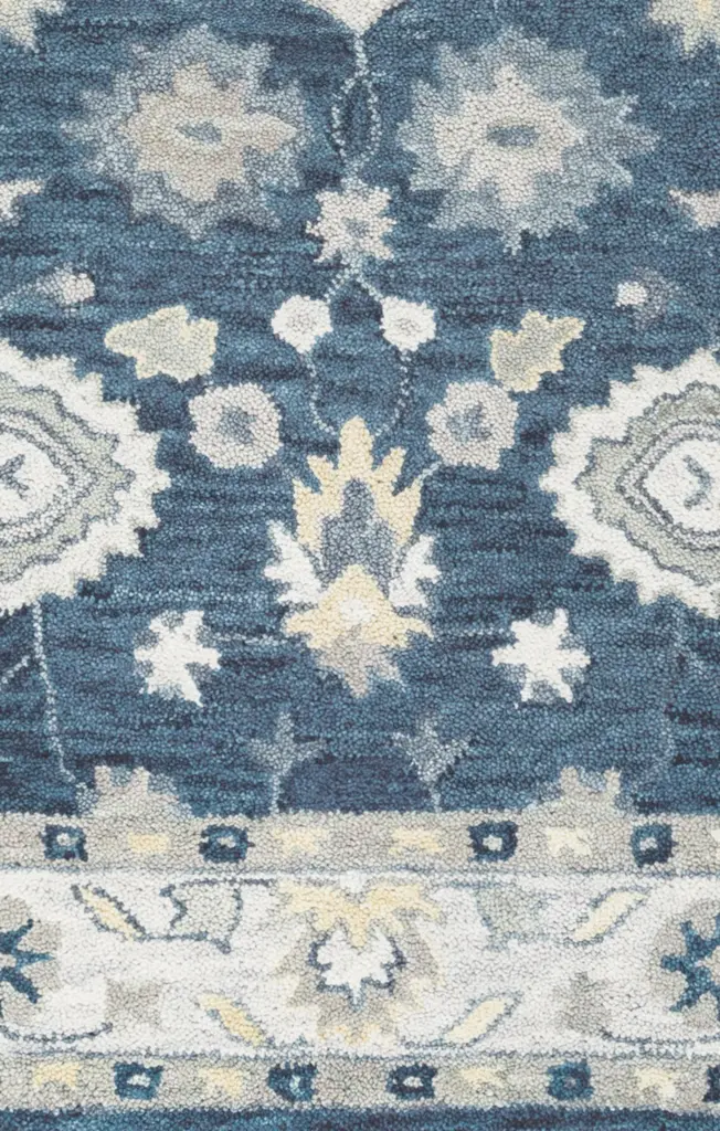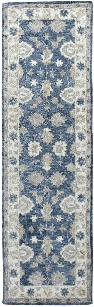 Collection: Leone Colors: Blue, Beige, Gray, Ivory Construction: Hand Tufted Material: Face: 100% Wool Pile: High Pile Pile Height: 0.6" Styles: Traditional Backing: Canvas Made In: India Price Range: $$$$$ (Affordable)
