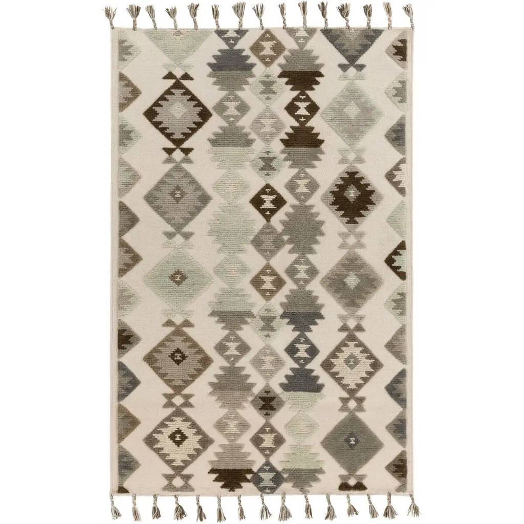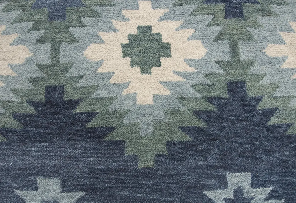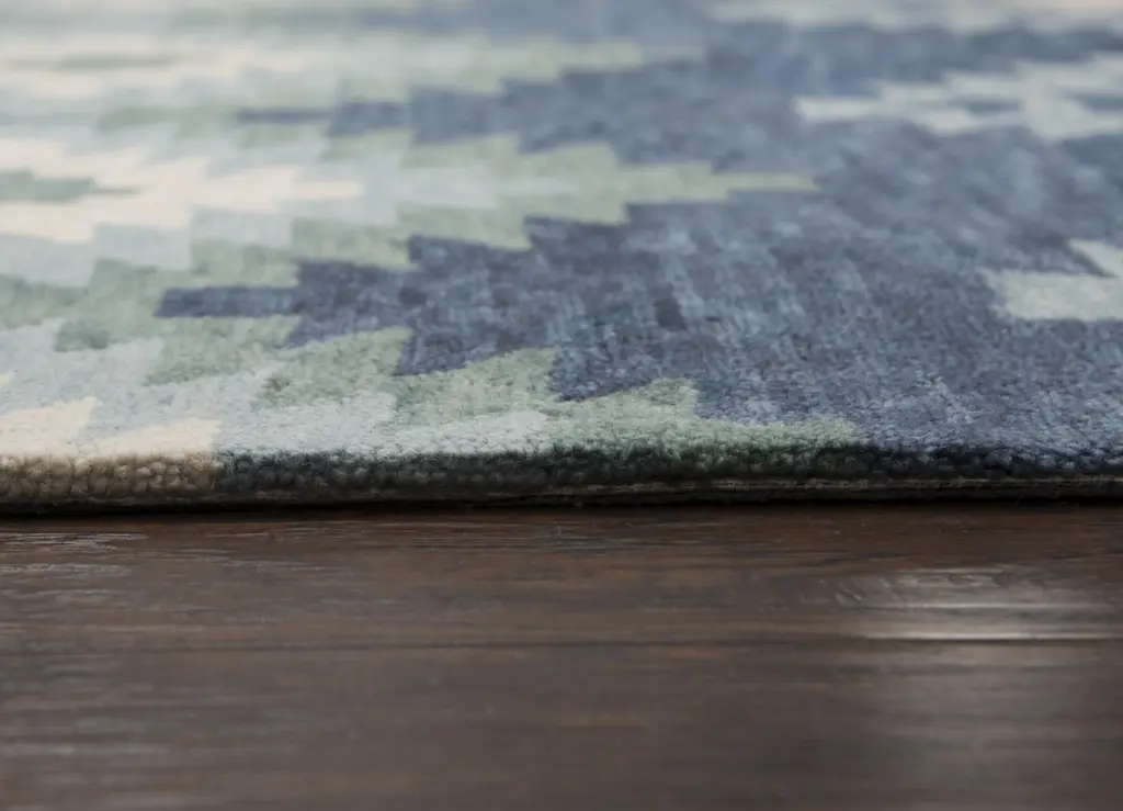 Collection: Leone Colors: Blue, Gray, Ivory Construction: Hand Tufted Material: Face: 100% Wool Pile: High Pile Pile Height: 0.6" Styles: Southwestern Backing: Canvas Made In: India Price Range: $$$$$ (Affordable)