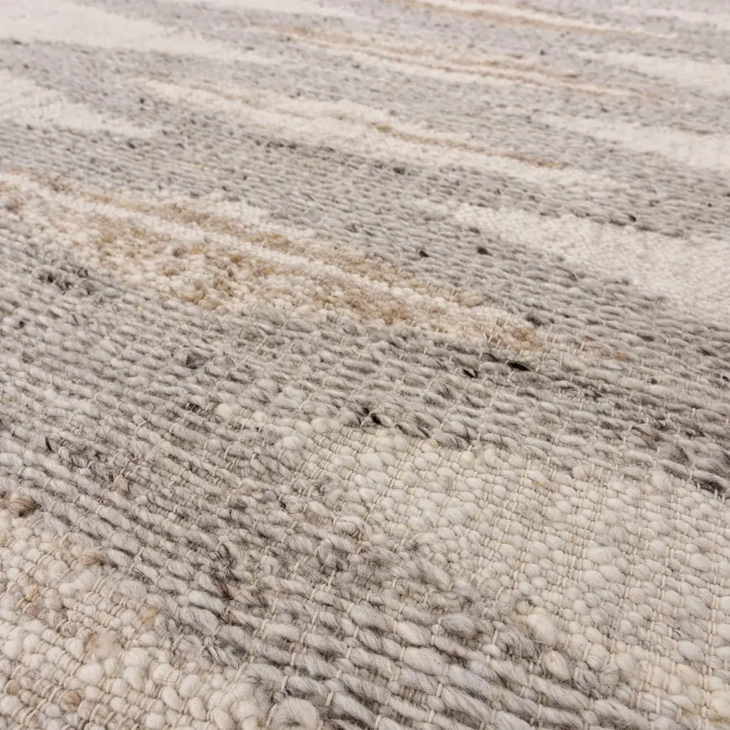Collection: Nova Colors: Beige, Light Gray, Ivory Construction: Hand Woven Material: Face: 100%Hand Spun Wool Pile: Medium Pile Pile Height: 0.4" Made In: India Price Range: $$$$$ (Premium)