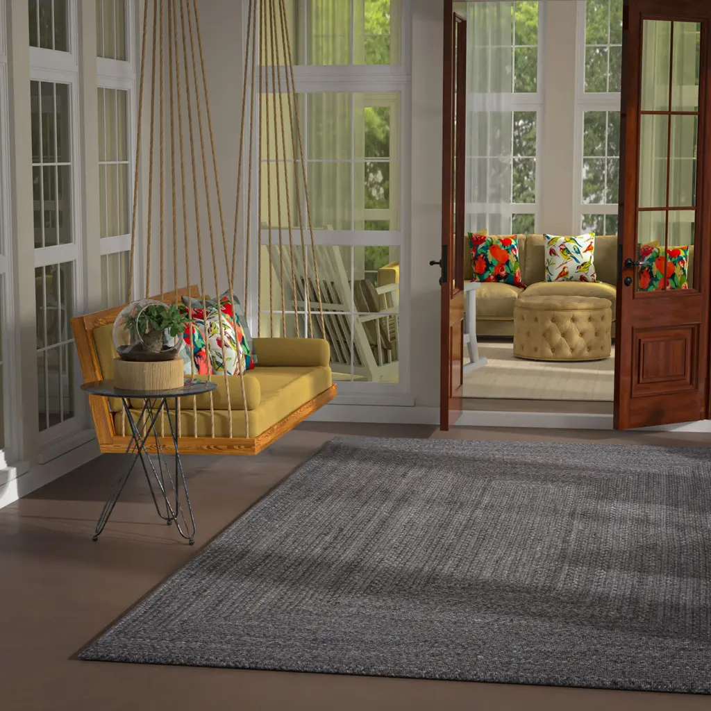 Collection: Pavilion Colors: Gray, Ivory Construction: Hand Woven Material: Face: 100% Recycled Polyester Pile: Medium Pile Pile Height: 0.3" Styles: Casual Outdoor Safe: Yes Made In: India Price Range: $$$$$ (Affordable)