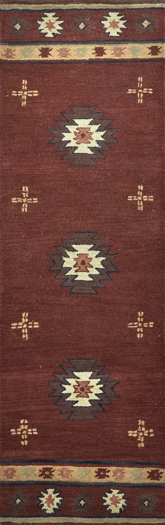 Collection: Southwest Colors: Red, Tan, Sage, Navy, Light Tan Construction: Hand Tufted Material: Face: 100% Wool Pile: High Pile Pile Height: 0.6" Styles: Southwestern Backing: Canvas Made In: India Price Range: $$$$$ (Affordable)