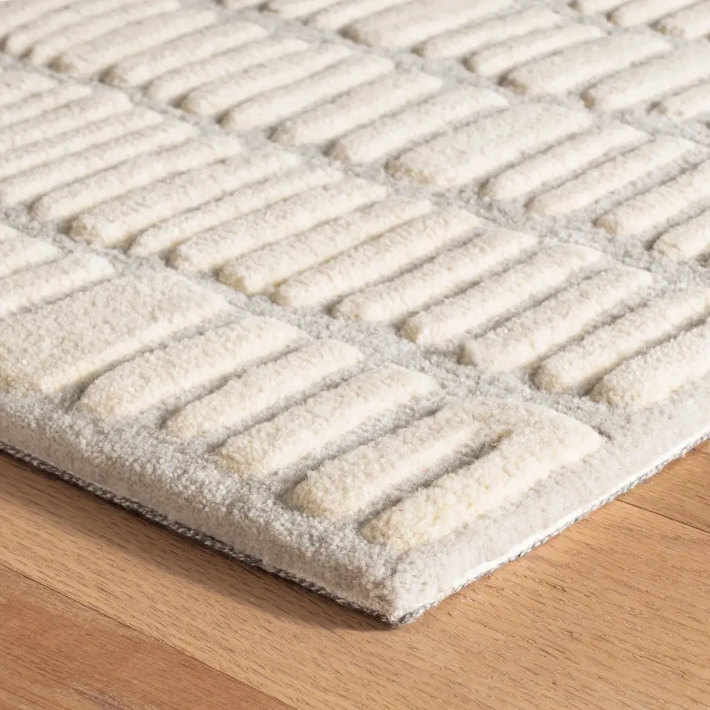 The rhythmical design of this luxurious, plush wool rug conjures surfaces of ancient hand-laid rock walls. The contrast between stone and mortar is further represented by the meticulously tufted high and low levels of the velvety hand-sheared pile. A signature motif of Marie Flanigan, an award-winning interior designer. This rug is a part of our design collaboration with Marie to produce a lifestyle collection that reflects her signature style of timeless elegance and innovative simplicity.