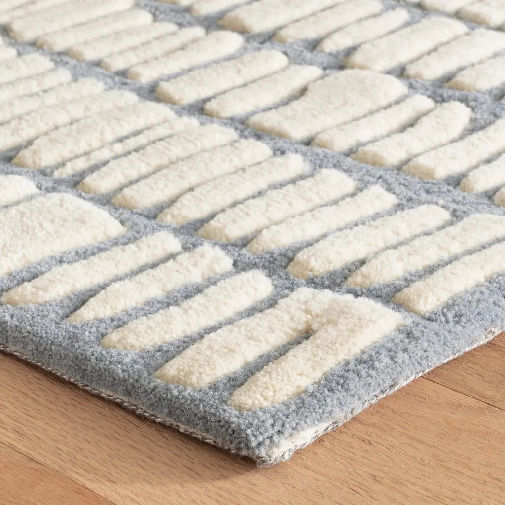 The rhythmical design of this luxurious, plush wool rug conjures surfaces of ancient hand-laid rock walls. The contrast between stone and mortar is further represented by the meticulously tufted high and low levels of the velvety hand-sheared pile. A signature motif of Marie Flanigan, an award-winning interior designer. This rug is a part of our design collaboration with Marie to produce a lifestyle collection that reflects her signature style of timeless elegance and innovative simplicity.