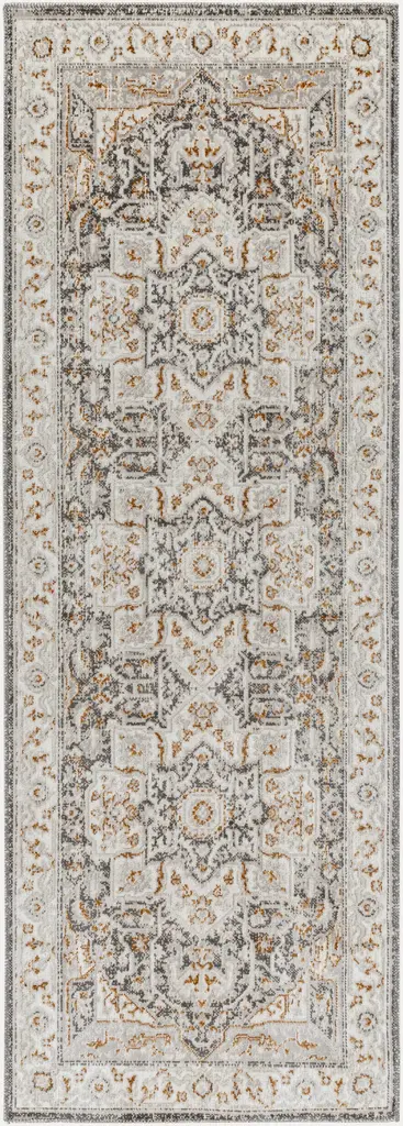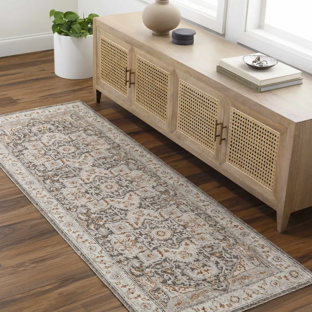 Collection: Roho Colors: Light Gray, Camel, Medium Gray, Dark Brown Construction: Machine Woven Material: 100% Polypropylene Pile: Low Pile Pile Height: 0.08" Styles: Traditional Machine Washable: Yes Made In: Turkey Thickness: 0.12" Price Range: $$$$$ (Most Affordable)