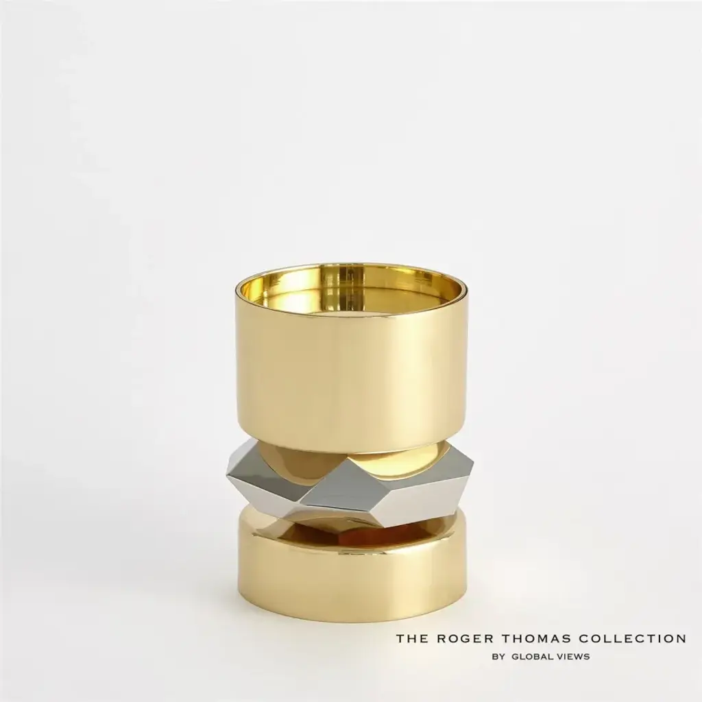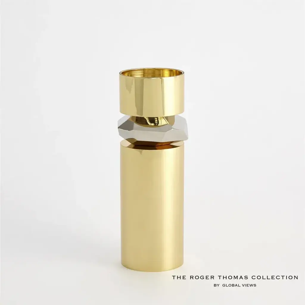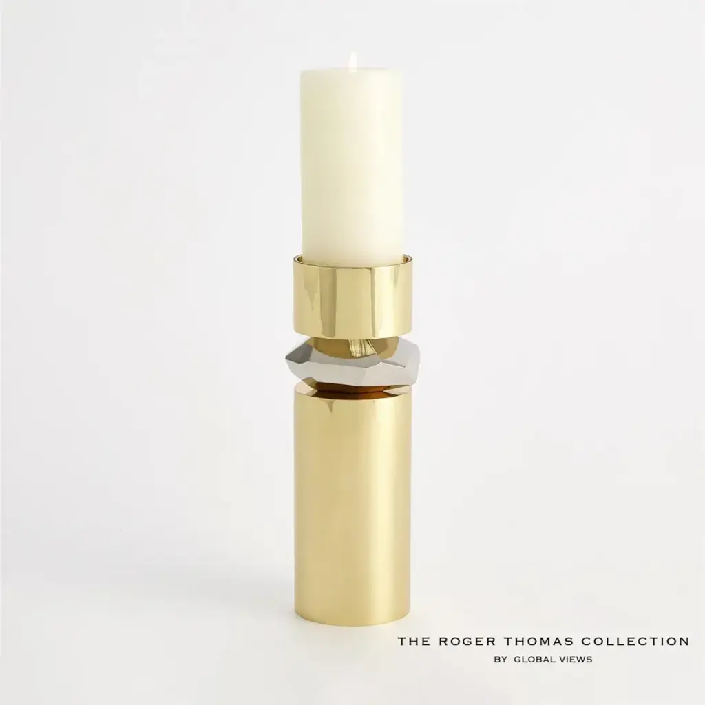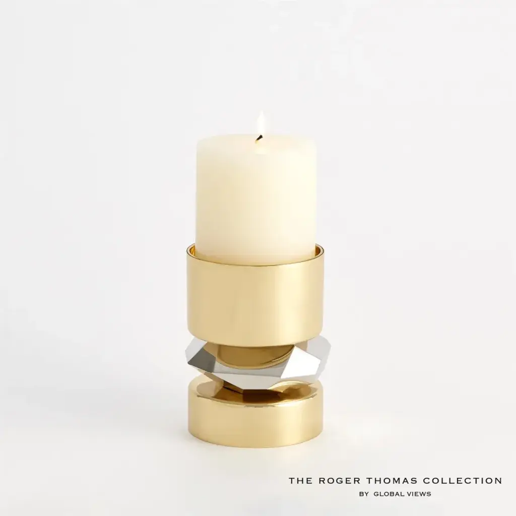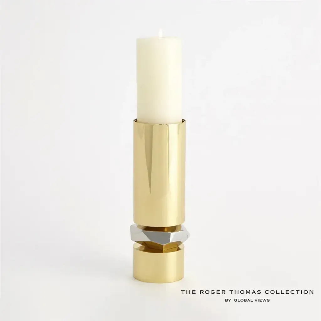 The Romano Brass Candle Holder is made of shiny brass and nickel-plated brass. Holds 3 inch pillar candle. From a fashion forward perspective, Global Views offers accessories, furniture, statement lighting, and an assortment of rugs and mirrors to add beauty and joy to your home.