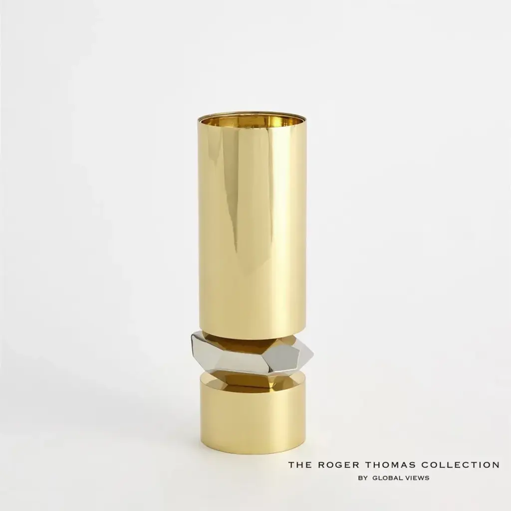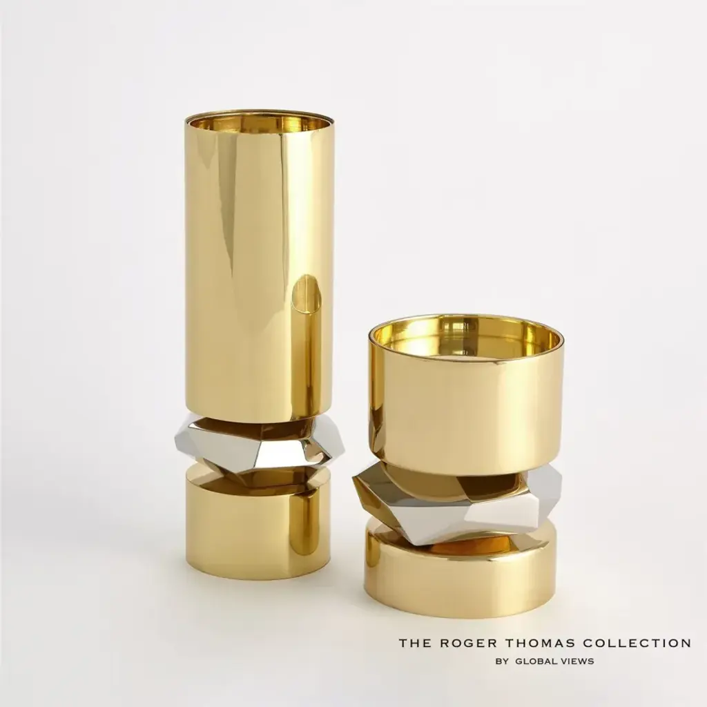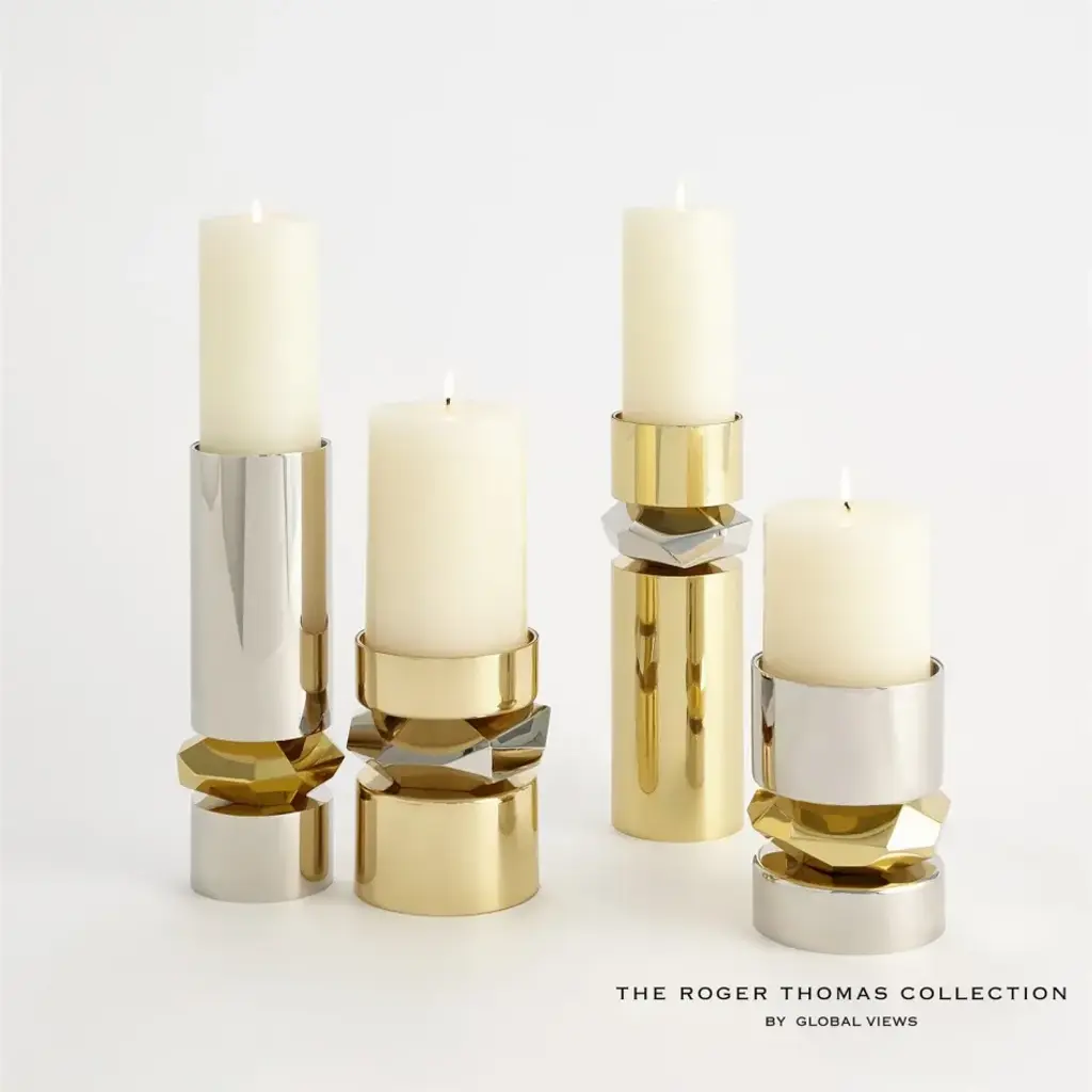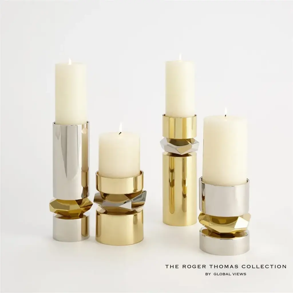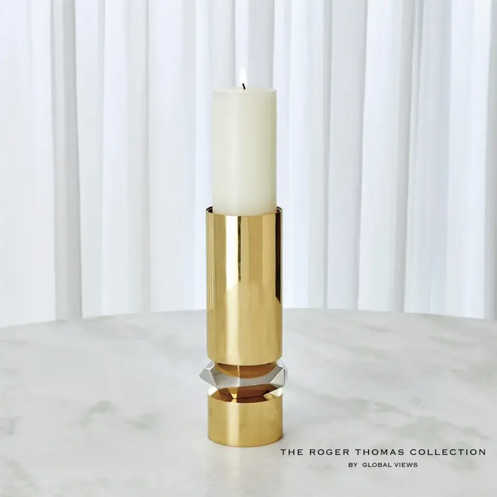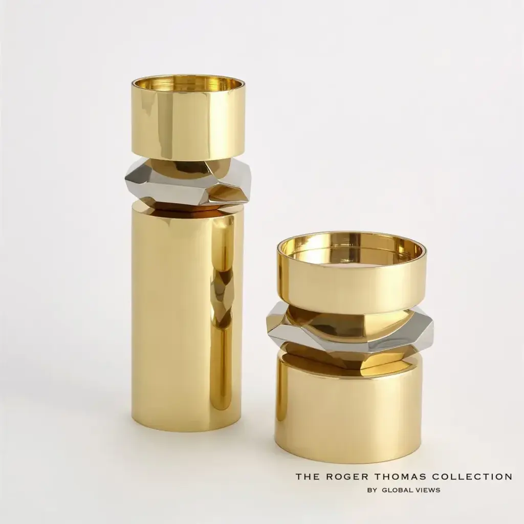 The Romano Brass Candle Holder is made of shiny brass and nickel-plated brass. Holds 3 inch pillar candle. From a fashion forward perspective, Global Views offers accessories, furniture, statement lighting, and an assortment of rugs and mirrors to add beauty and joy to your home.