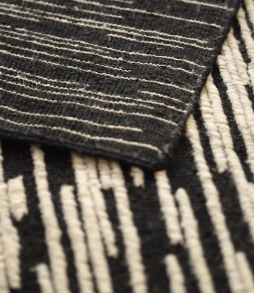 Ronan Bouroullec 'Doblecara 1' Reversible Rug for Nanimarquina. New, current production.Doblecara, designed by Ronan Bouroullec, reflects his spirit of geometry through subtle linear and intermittent strokes ending in a blurred point, creating a sense of movement in the viewer's eye.The mastery and indefatigable desire to always go one step further resulted in this collection with a double meaning. Doblecara is a reversible rug, both sides of which can be enjoyed, the ‘A’ side shows the straight-lined design in its maximum expression while the ‘B’ side being the most subtle and delicate.At DEZAAK DELUXE we try to find items that are out of the ordinary. With experience over 40 years, we are known for our singular eye and combining the new and the old. We have a few thousand items in stock in our beautiful showroom in a reclaimed factory building out of the 1930s.
