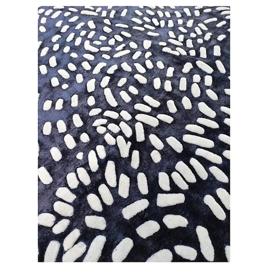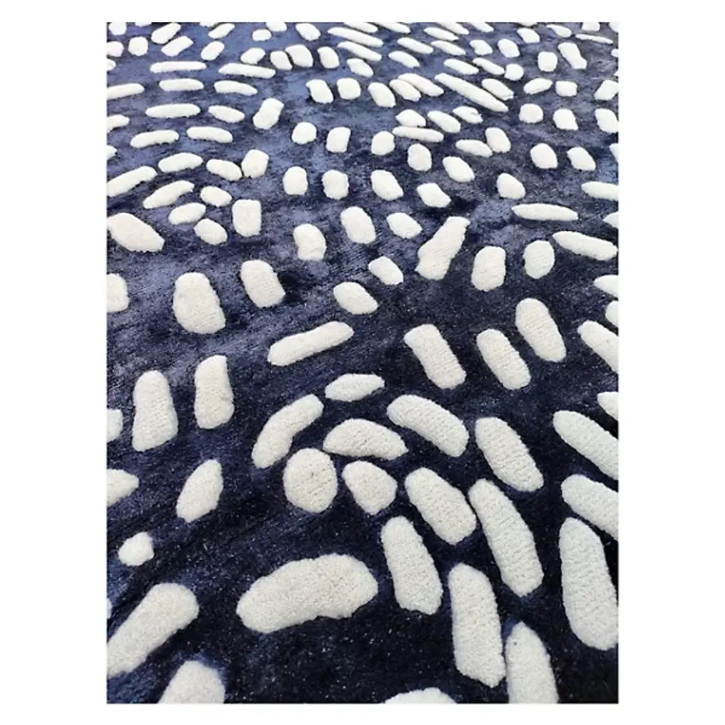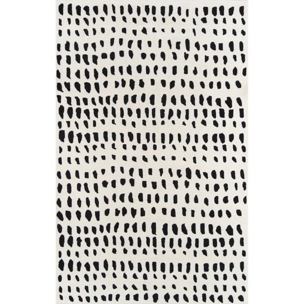 Provide a vibrant and engaging element of contrasting style to indoor spaces with the Ronin Area Rug from Illulian. A rectangular assembly of knotted wool and silk fibers fashioned in Nepal, it sprinkles bright, small notes across a black background, updating old production methods with newer designs and artistic elements. The engaging monochromatic character draws the eye, adding a playful presence to its surroundings.