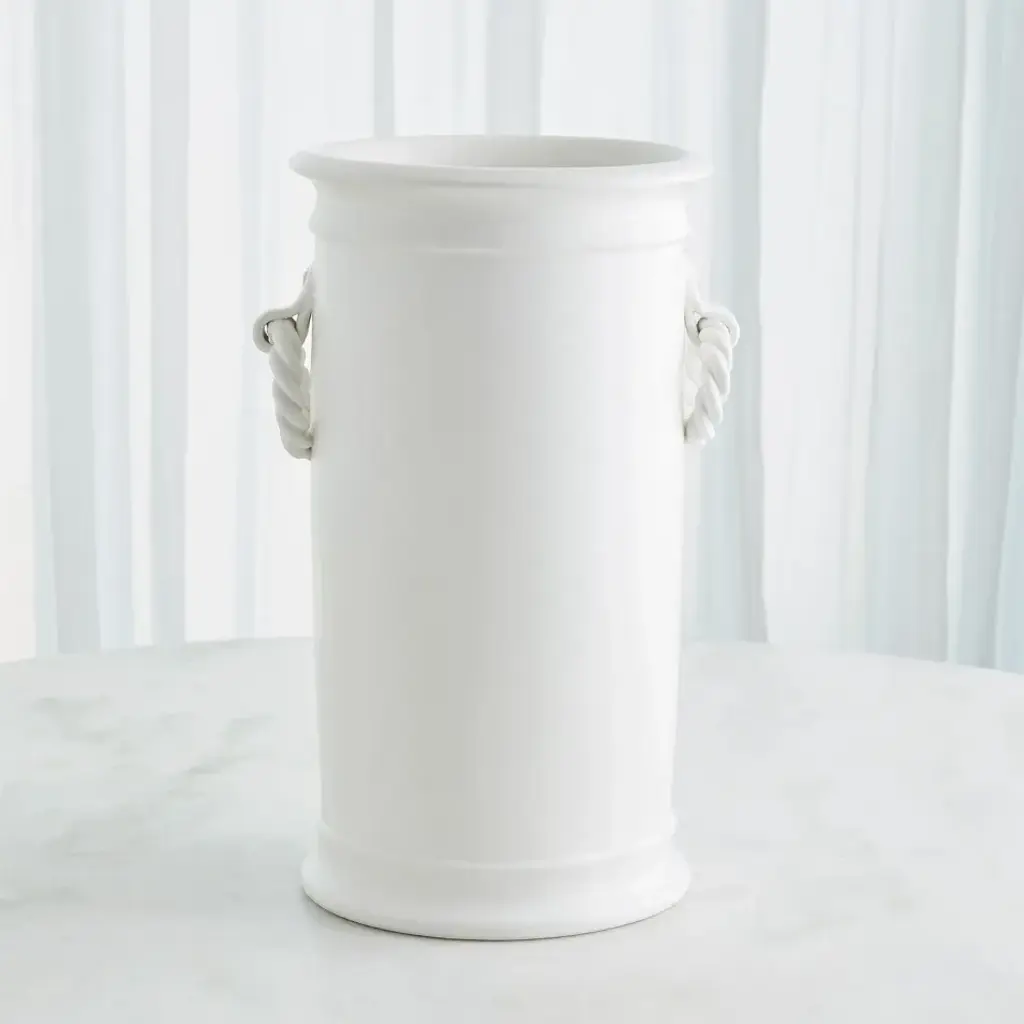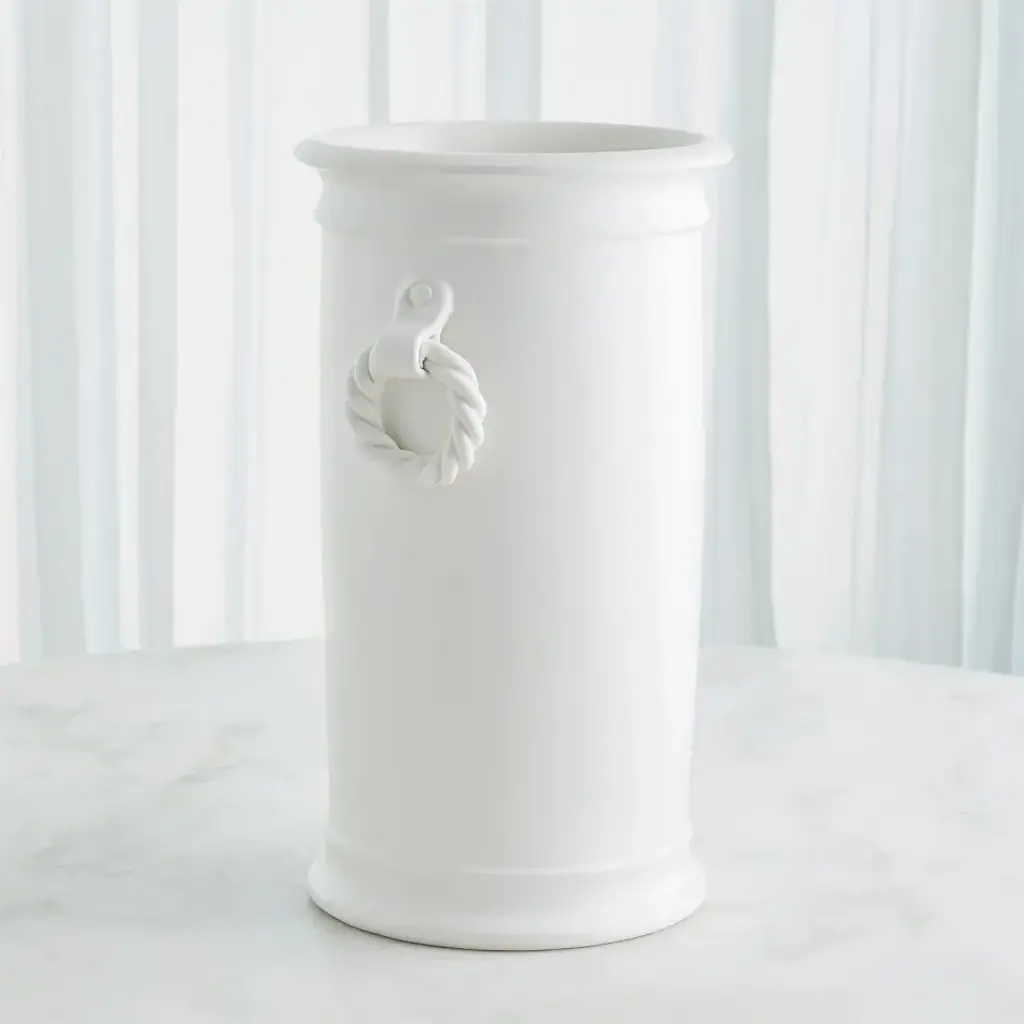 The Rope Handle Vessel is a true embodiment of Italian craftsmanship. Artisans employ the age-old technique of hand-packing clay into a mold through a process known as Calco. Each mold is left to dry for 2-3 days, during which the clay naturally shrinks, making it easy to remove the mold. Following this, the urn undergoes firing in a kiln at 950 degrees, and a second firing ensues, adding a white glaze finish. The result is a stunning piece that beautifully blends tradition and elegance. From a fashion forward perspective, Global Views offers accessories, furniture, statement lighting, and an assortment of rugs and mirrors to add beauty and joy to your home.