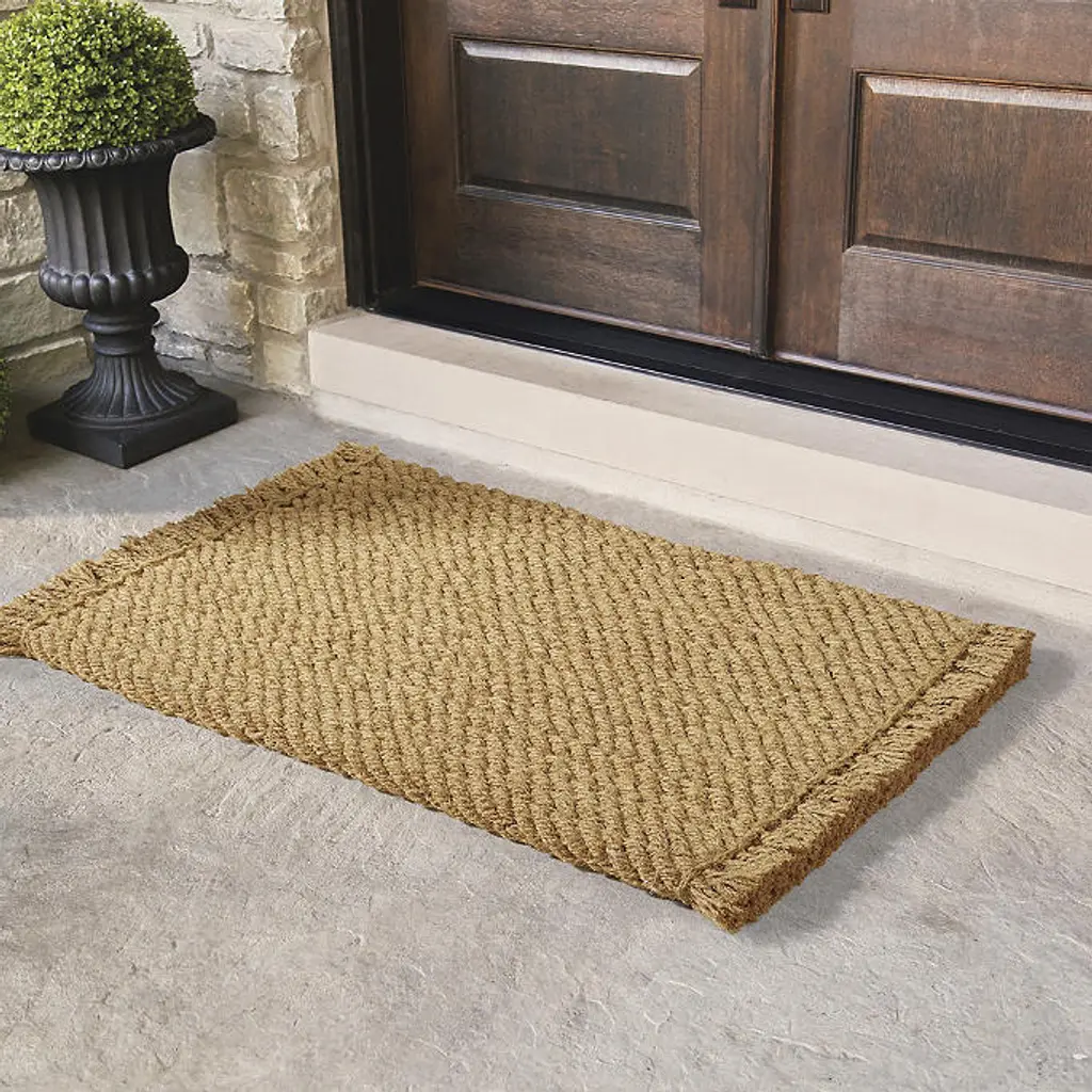 Fringe edges highlight the artisanal warmth of our handwoven Roped in Door Mat. Rows of naturally strong and absorbent shredded coconut husks create rich texture and a surface that scrapes away dirt and soaks up water. 100% natural coir fibers 1.2" thick Fringe edges Handwoven Thicker and heavier than synthetic or fabric mats Add an outdoor rug pad (sold separately) to increase water drainage and prevent slippingPlace in a sheltered area View complete care instructions Do not place in area where it will remain wet for long periods of time with no sunlight for drying Not recommended for use on porcelain, natural stone, slate, granite, cobblestone or limestone porches that have been chemically sealed Imported At Frontgate, our primary focus is quality. We guarantee that every product we sell will stand up to the supreme test – our customers' satisfaction. To learn more about our policies, visit our Shipping & Processing, Returns & Exchanges and Warranty & Price Guarantee pages. Fringe edges highlight the artisanal warmth of our handwoven Roped in Door Mat. Rows of naturally strong and absorbent shredded coconut husks create rich texture and a surface that scrapes away dirt and soaks up water. 100% natural coir fibers 1.2" thick Fringe edges Handwoven Thicker and heavier than synthetic or fabric mats Add an outdoor rug pad (sold separately) to increase water drainage and prevent slippingPlace in a sheltered area View complete care instructions Do not place in area where it will remain wet for long periods of time with no sunlight for drying Not recommended for use on porcelain, natural stone, slate, granite, cobblestone or limestone porches that have been chemically sealed Imported At Frontgate, our primary focus is quality. We guarantee that every product we sell will stand up to the supreme test – our customers' satisfaction. To learn more about our policies, visit our Shipping & Processing, Returns & Exchanges and Warranty & Price Guarantee pages.