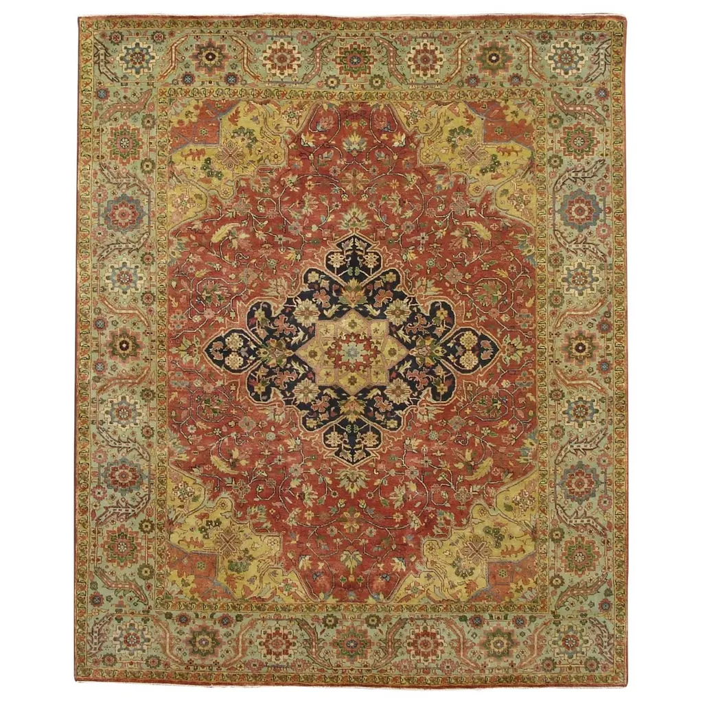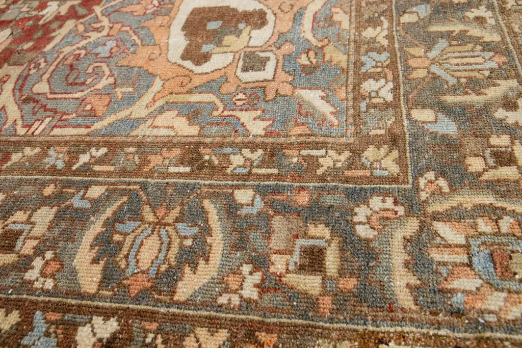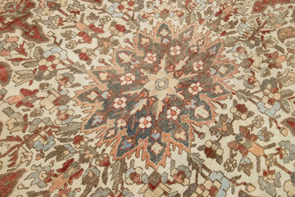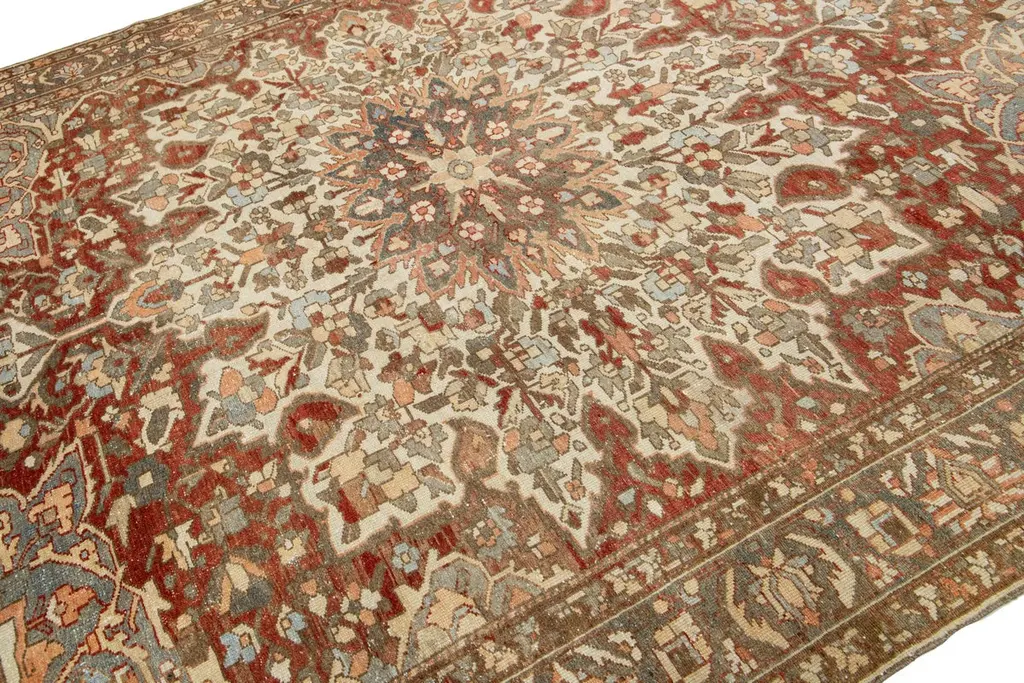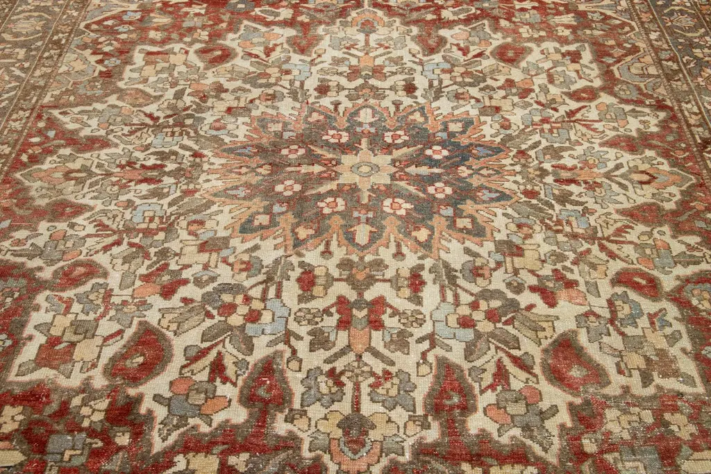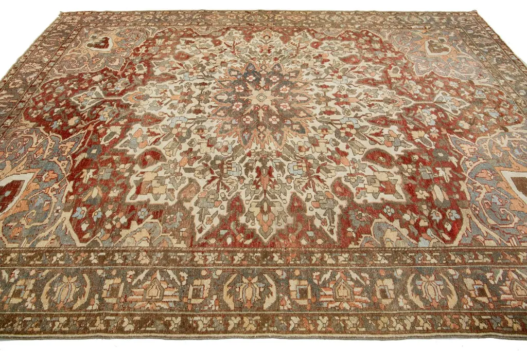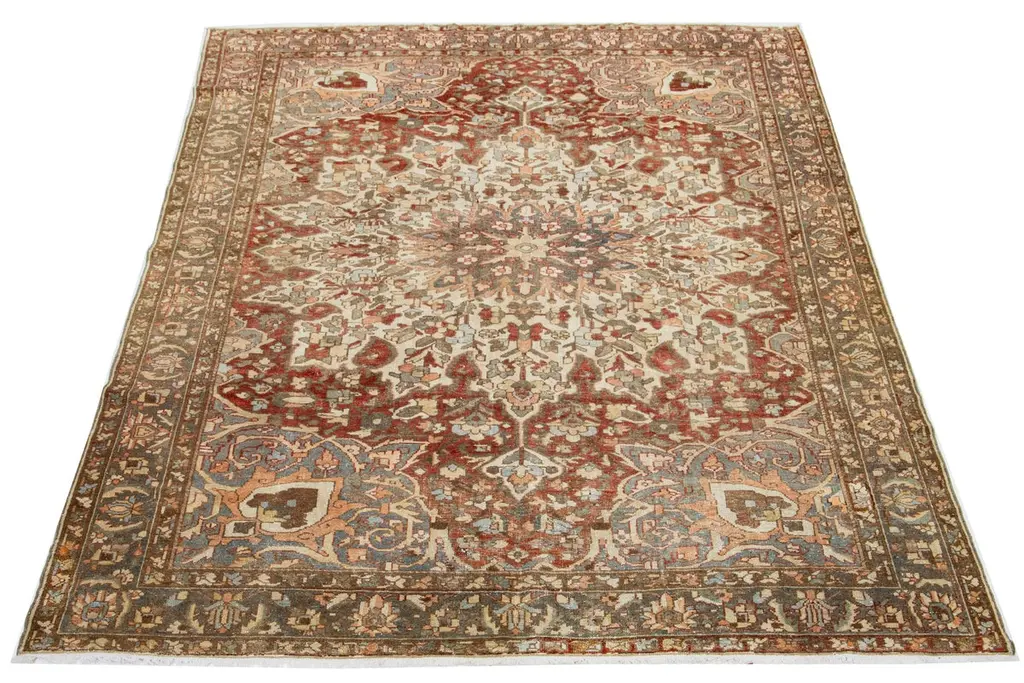 This is a beautiful Antique Bakhtiari hand-knotted wool rug with a rust-colored field. The Persian rug showcases a timeless rosette motif with peach, beige, and blue hues.This rug measures 9'1" x 11'10".