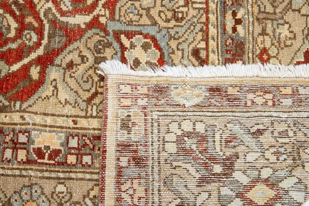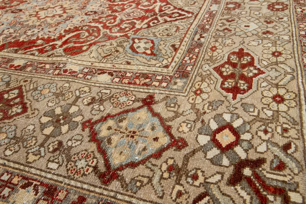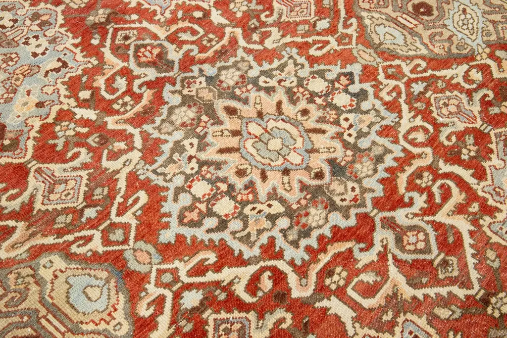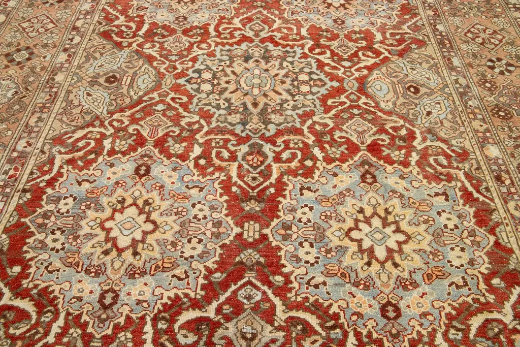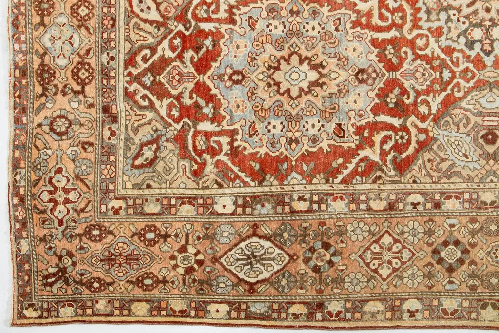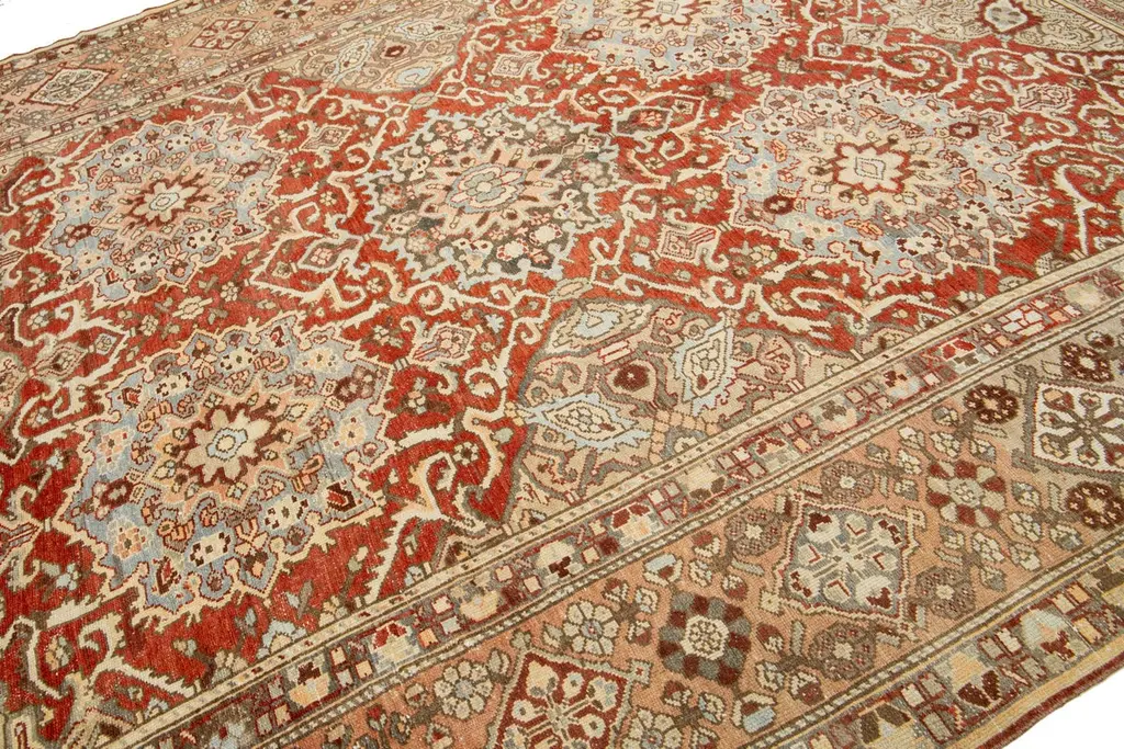 Beautiful Antique Bakhtiari hand-knotted wool rug with a red-rust color field. This Persian piece has blue, beige, and peach hues on a classic rosette design.This rug measures 9'7" x 12'2".
