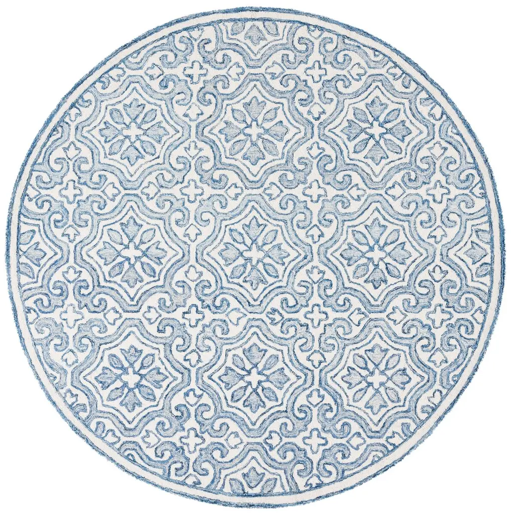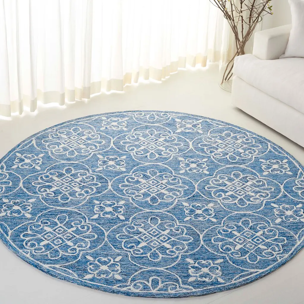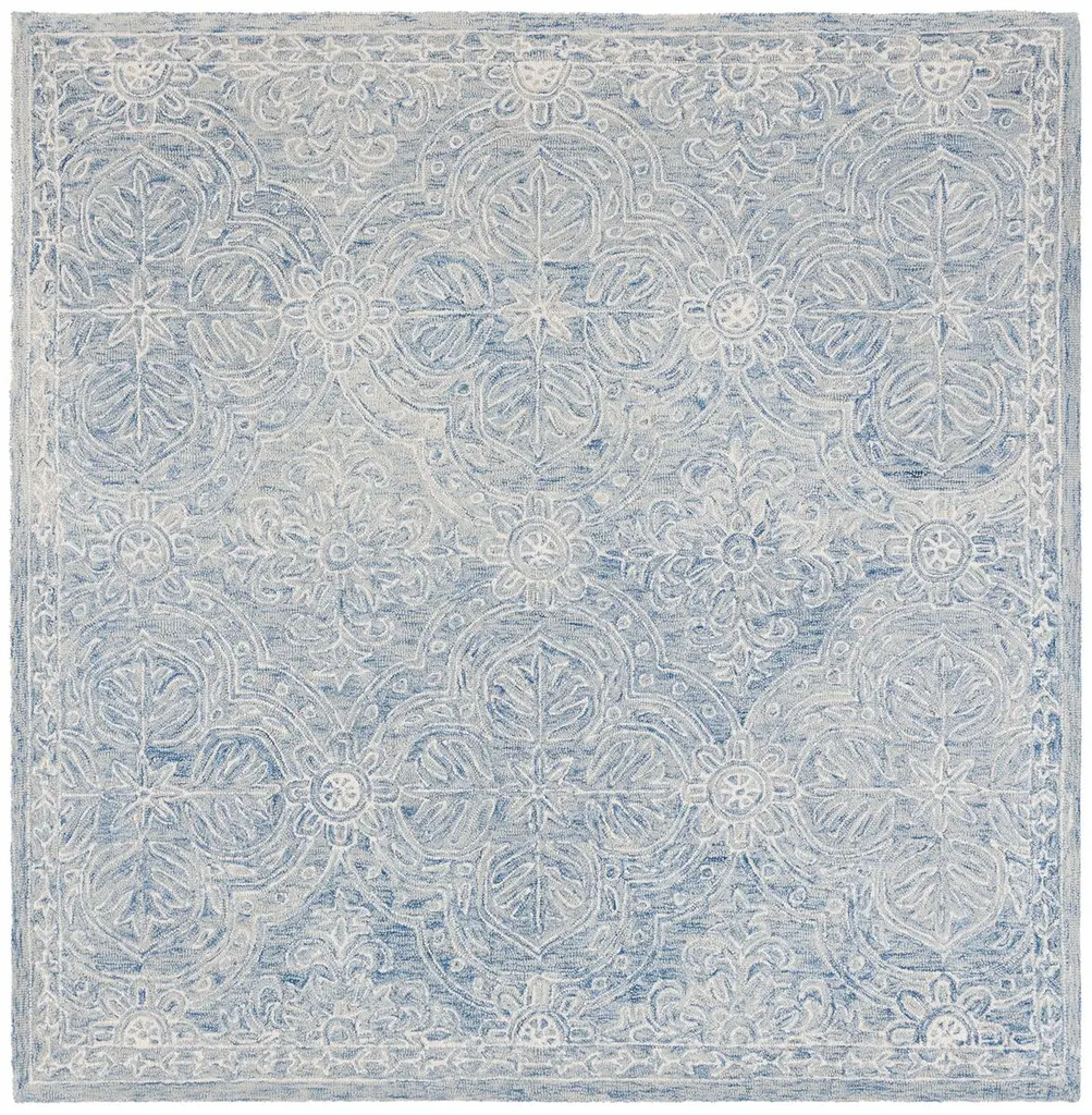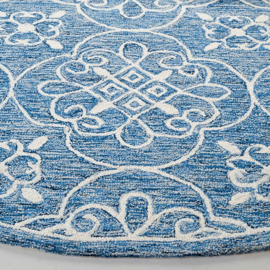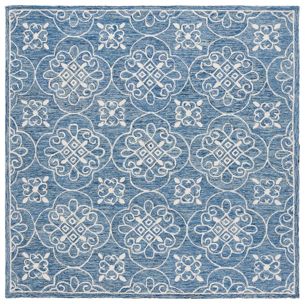 Transform your living space with this exquisite navy and ivory area rug, meticulously crafted to bring a touch of elegance to any room. Measuring 7 feet by 7 feet, this square rug features an intricate oriental pattern that adds warmth and character to traditional settings. Hand tufted from a blend of wool and cotton, it offers a soft and inviting texture underfoot. With a height of 3/8 inch, this rug effortlessly integrates with various flooring types. Originating from India, this rug is a testament to skilled craftsmanship and design. Introduce it to your home and experience a perfect blend of style and comfort that complements your decor beautifully.