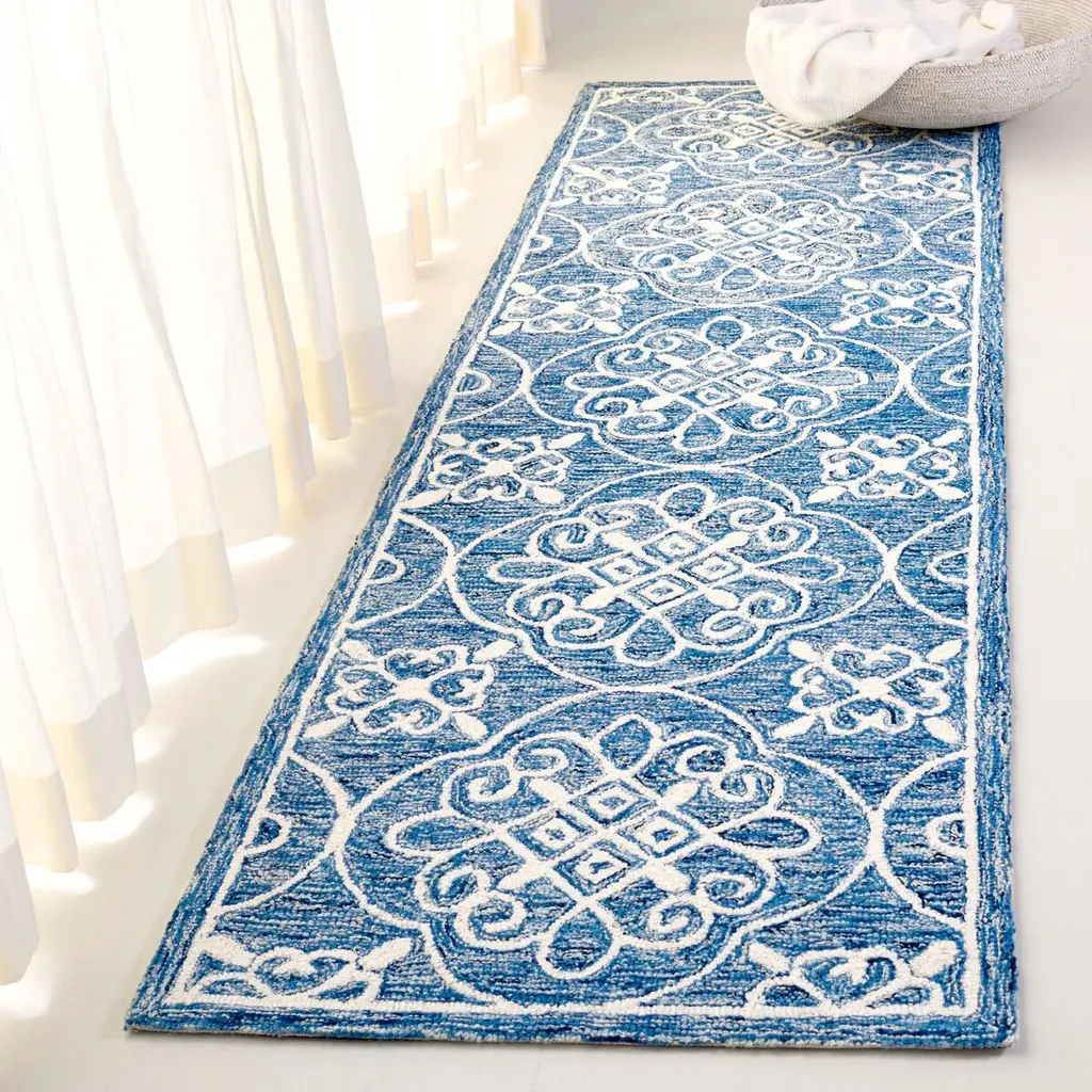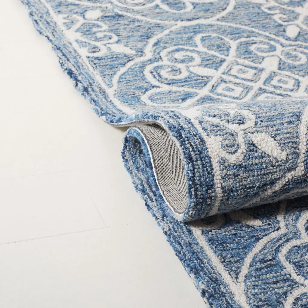 Transform your living space with this exquisite navy and ivory area rug, meticulously crafted to bring a touch of elegance to any room. Measuring 7 feet by 7 feet, this square rug features an intricate oriental pattern that adds warmth and character to traditional settings. Hand tufted from a blend of wool and cotton, it offers a soft and inviting texture underfoot. With a height of 3/8 inch, this rug effortlessly integrates with various flooring types. Originating from India, this rug is a testament to skilled craftsmanship and design. Introduce it to your home and experience a perfect blend of style and comfort that complements your decor beautifully.