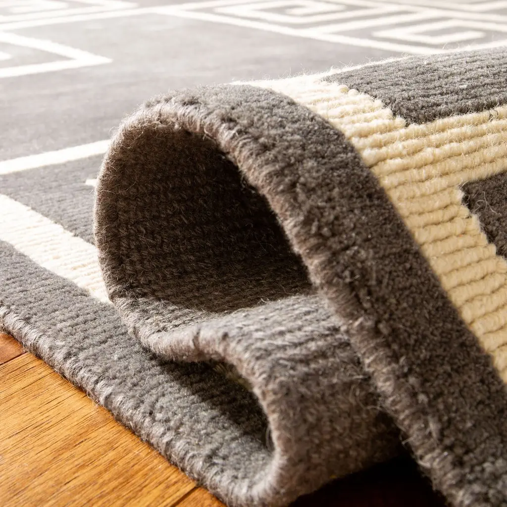 Elevate your living space with the sophisticated charm of our hand-knotted wool pile rug, imported directly from the skilled artisans of India. Designed to delight, this 2' X 3' accent rug boasts a plush 1/2" height, promising comfort underfoot with a luxurious feel. Our rug is a true testament to craftsmanship, featuring a striking slate and cream color combination that effortlessly complements any decor scheme. The timeless Greek key pattern imbued across its surface adds a touch of elegance, making it more than just a rug but a piece of art for your floors. Expertly constructed using age-old hand-knotting techniques, each rug promises durability and a unique character that machine-made counterparts simply cannot match. Indulge in the luxury of pure wool, known for its natural resilience and soft texture, ensuring this rug will be a cherished addition to your home for years to come. Ideal for adding a decorative touch to small spaces or serving as a sophisticated focal point in any room, this rug's versatility and style make it a must-have for those who appreciate quality and design. Discover the perfect blend of tradition and trend with this exquisite Indian-made wool area rug.