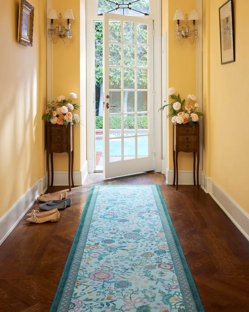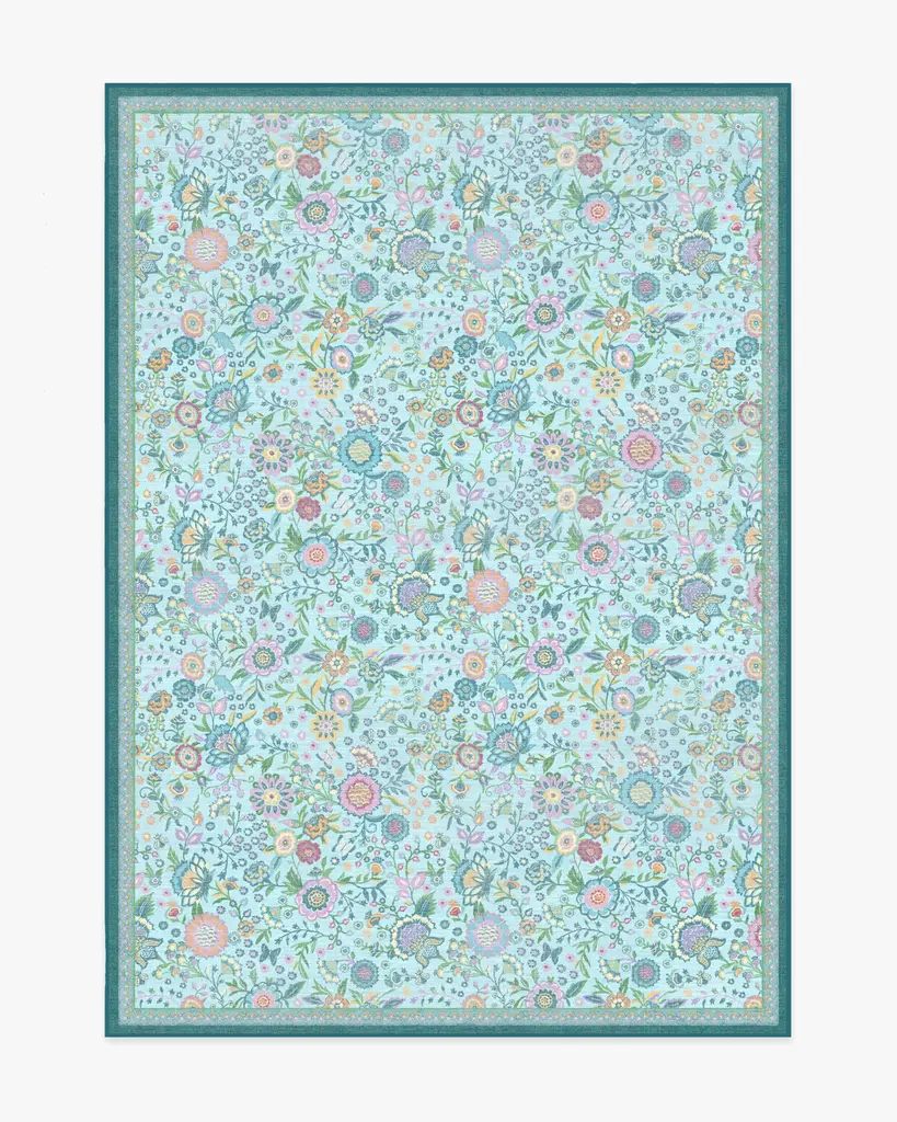 Capture the whimsy of the Bridgerton floral gardens with our Bridgerton Royal Garden Multicolor Rug. This bright and ditzy design features a medley of fun flowers in maroons, greens, oranges, and yellows against a soft blue background. It's the perfect rug to get swept off your feet. Water-resistant, stain-resistant, and machine-washable. Rug colors may vary slightly according to your device and the lighting in your space.