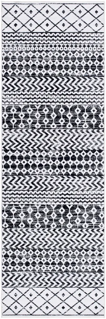 Collection: Royko Colors: White, Gray, Onyx, Light Silver, Silver Gray, Slate Blue Construction: Machine Woven Material: 100% Polyester Pile: Low Pile Pile Height: 0.12" Styles: Transitional,Bohemian Backing: Canvas Machine Washable: Yes Made In: China Thickness: 0.25" Price Range: $$$$$ (Most Affordable)