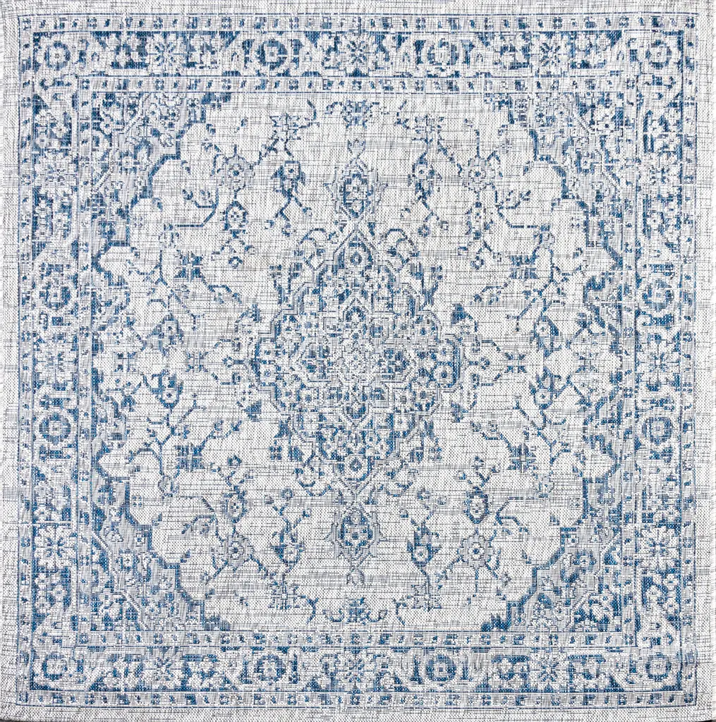 This ornate medallion rug's lively pattern adds dreamy Bohemian style to an outdoor porch or patio. Varied tones of gray mingled with a blue and navy pattern give this rug a hand-woven, vintage vibe. The flatweave design is great for high-traffic spaces indoors too.
