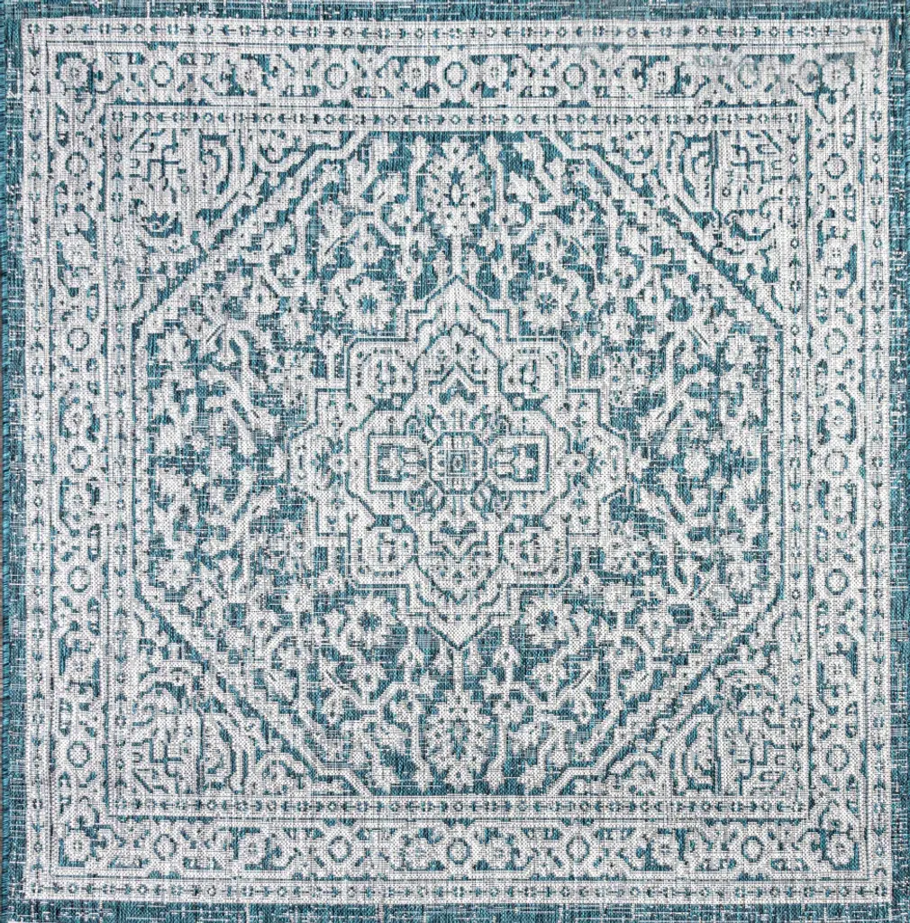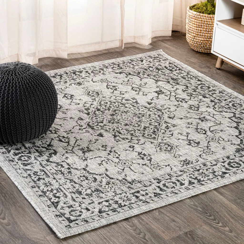 This ornate medallion rug''s lively pattern adds dreamy Bohemian style to an outdoor porch or patio. Varied tones of gray mingled with a black pattern give this rug a hand-woven, vintage vibe. The flatweave design is great for high-traffic spaces indoors too. Features:• Flat-weave construction of 100% polypropylene• Gray and black with a handwoven mingled texture• Water resistance with 0.19" pile• 100% Polypropylene• No backing, use of rug pad is recommended (sold separately)• Power Loomed in Turkey• Actual Dimension: 5 ft. 3 in. x 5 ft. 3 in. Square• Color: Gray/Black• Thickness measures: 0.19 in.• Available in multiple sizes and/or colorsRug Care:• Vacuum regularly and spot clean as needed; avoid direct and continuous exposure to sunlight; use brushless vacuum; remove spills immediately; if liquid, blot with clean, undyed cloth by pressing firmly around the spill to absorb as much as possible; for hard to remove stains, professional rug cleaning is recommended; store in a dry, well ventilated area and rotate for consistent wear• Packing and shipping may cause temporary creases in rugs, which will flatten out after a week on the floor; to expedite the process, try back-rolling your rug before laying it down, and then allow ample time for the remaining creases to relax• Please Note: Due to differences in monitors, some rug colors may vary slightly. Lengths and widths may vary from the published dimensions. Patterns may vary slightly according to shape and size selected.About us:Style your floors with JONATHAN Y. By combining fine craftsmanship and design, this New York creative studio is bringing fashion to your floors. The collection mixes sustainable organic materials, vibrant colors and trend worthy styles to create JONATHAN Y''s distinctive catalog of rugs.