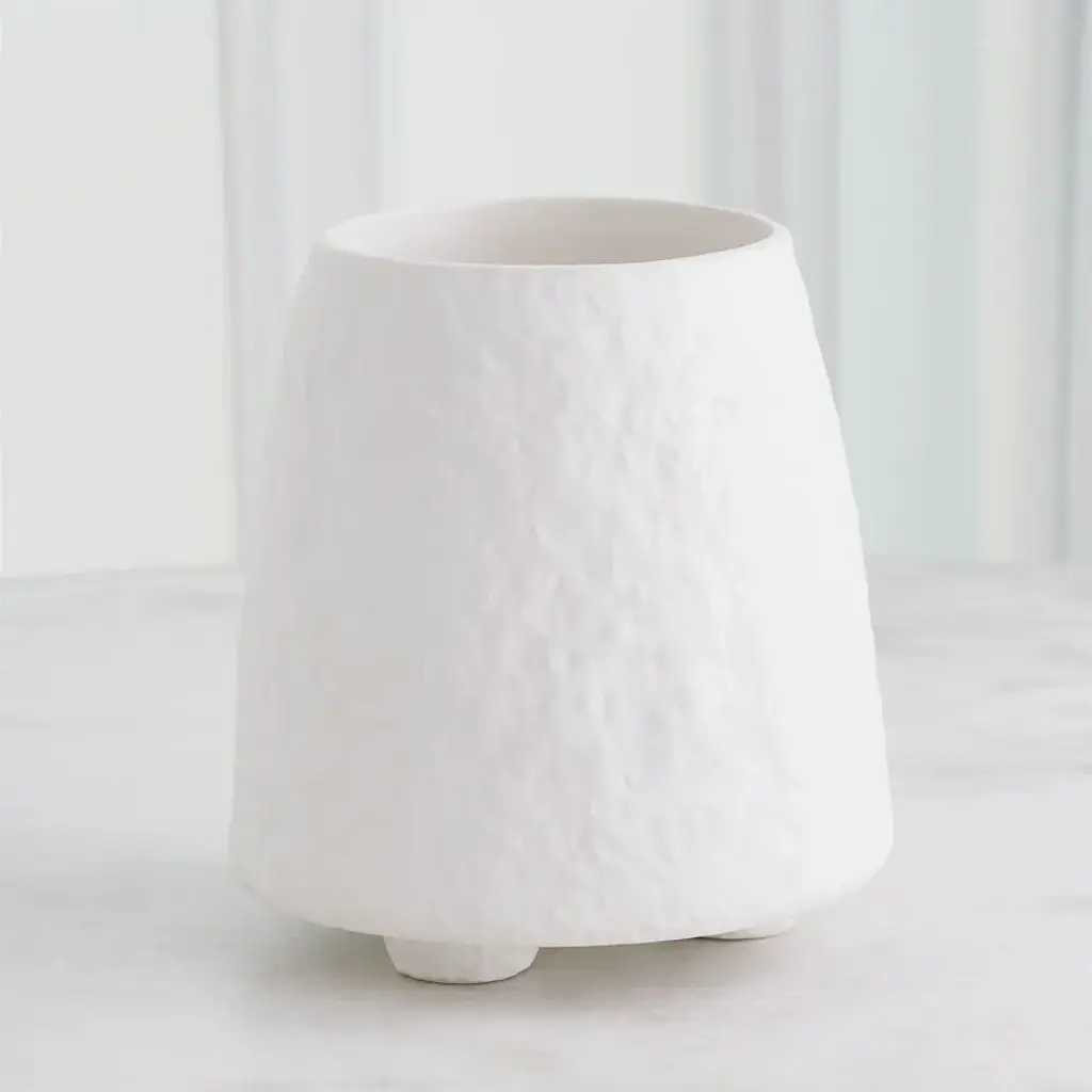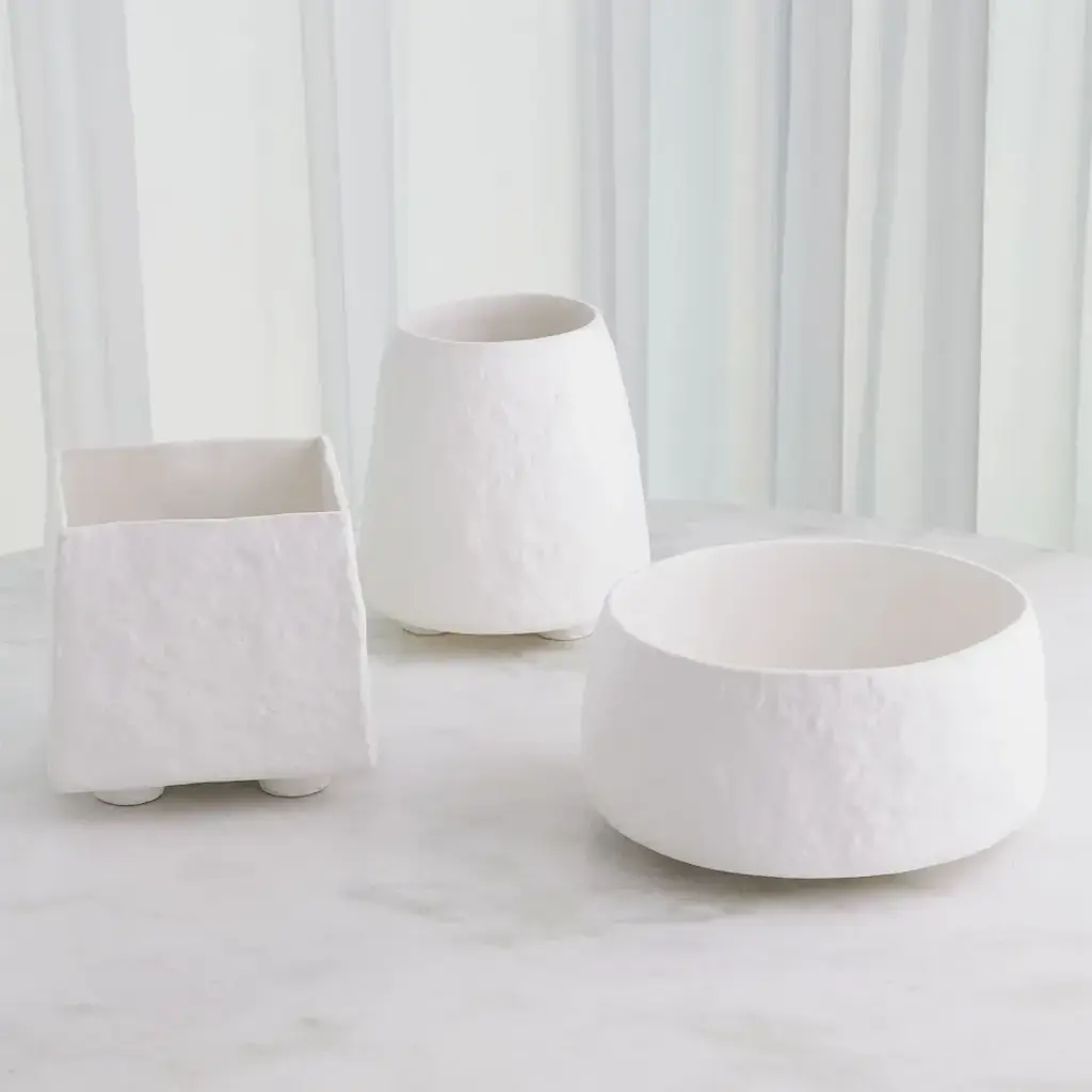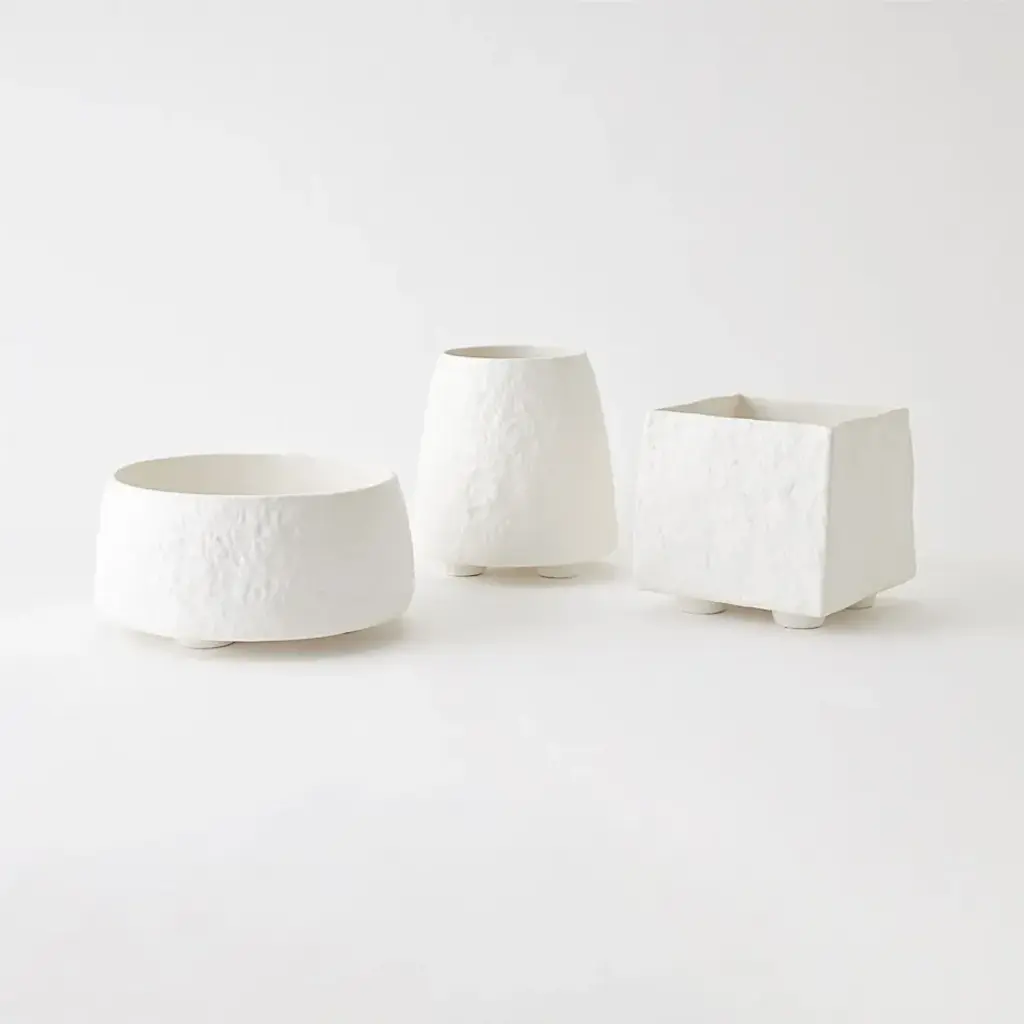 The Rubble Planters are skillfully crafted from slip-molded Portuguese ceramic, boasting a white finish and a textured exterior. These planters are not only aesthetically pleasing but also water-tight, making them an ideal choice for showcasing your favorite plants. From a fashion forward perspective, Global Views offers accessories, furniture, statement lighting, and an assortment of rugs and mirrors to add beauty and joy to your home.