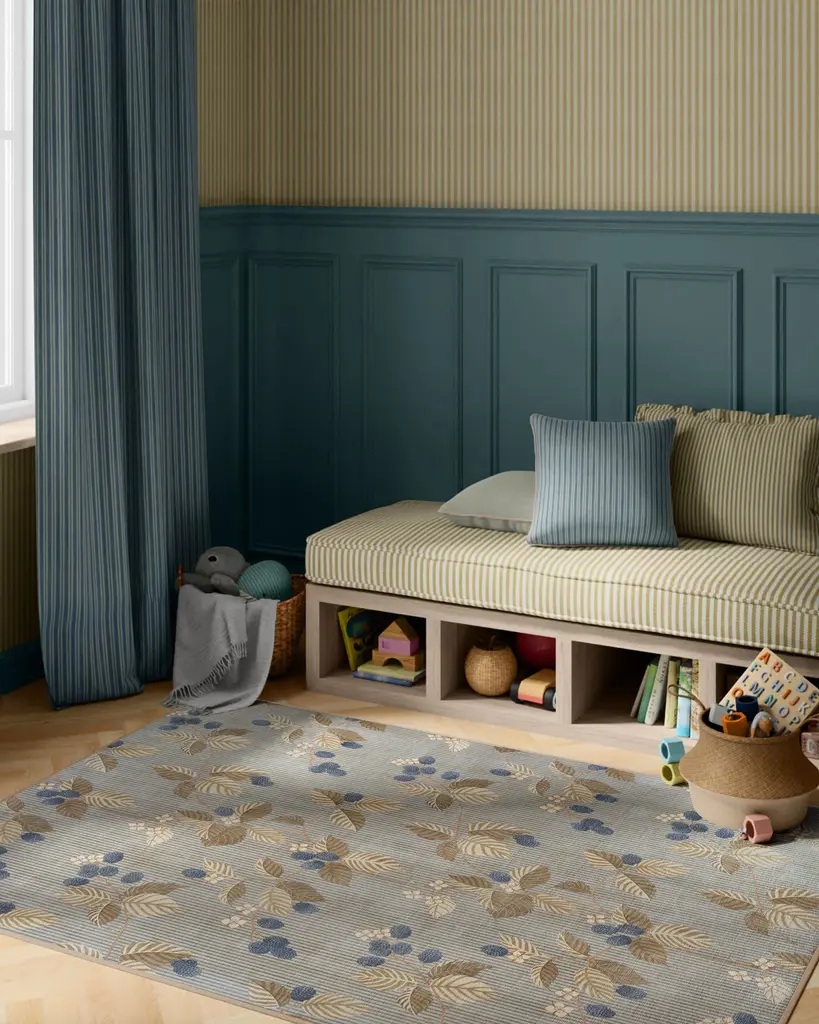 Bring home woodland wonder with our Sanderson Rubus Azure & Fawn Rug. Showcasing the blackberry Rubus, a genus of flowering plants in the rose family, raspberries and blackberries sit against a simple striped background. A palette of navy and blue shades—complemented by browns, creams, and pinks—contrasts beautifully with the neutral beige background. Water-resistant, stain-resistant, and machine-washable. Rug colors may vary slightly according to your device and the lighting in your space.