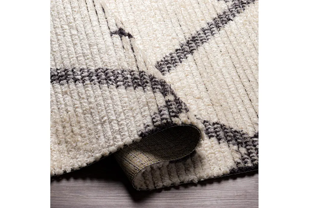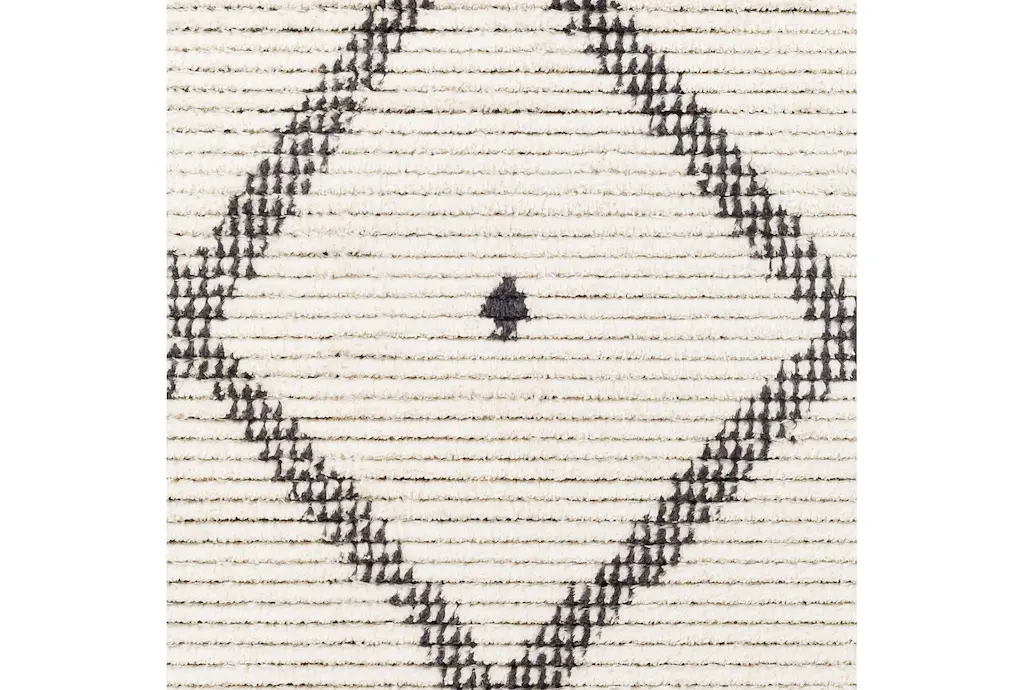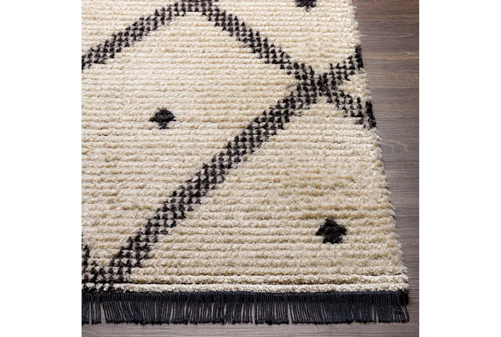 Enhance your living space with the Rug-5'3"X7' Rufino Boho Diamond With Fringe Black/Cream by Surya. This modern area rug features a striking geometric pattern in black and cream, perfect for adding a touch of sophistication to any room. Made from durable polyester, it is designed to withstand high-traffic areas while providing a soft and comfortable feel underfoot.
