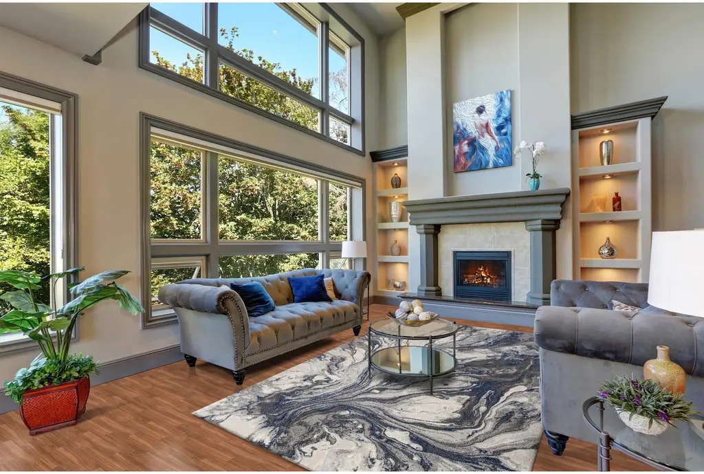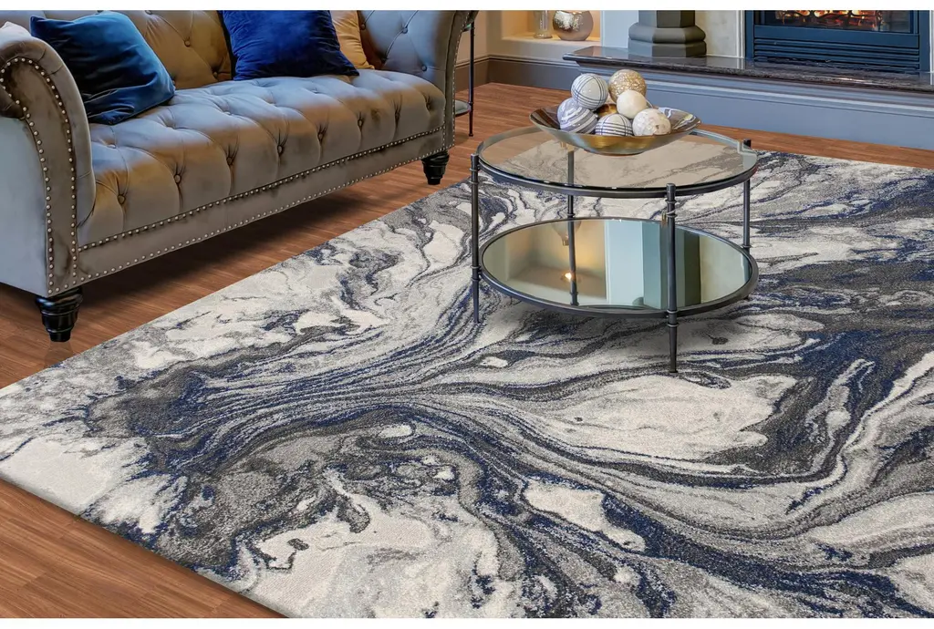 This beautiful indoor modern rug, measuring 9'10"X13'2", boasts a stunning grey and blue marble swirl design and is made with high-quality fiber and polypropylene materials. Perfect for any room in your home, this rug is not only stylish but also easy to ship with parcel shipping.