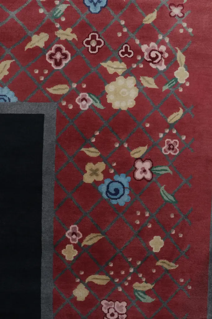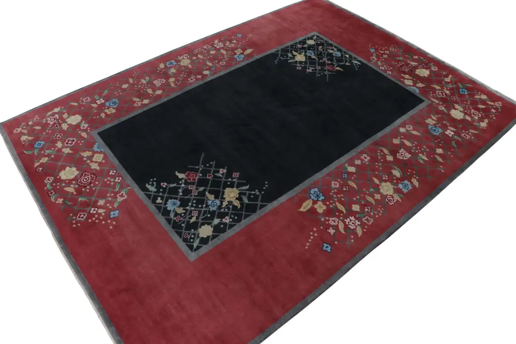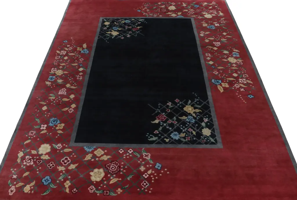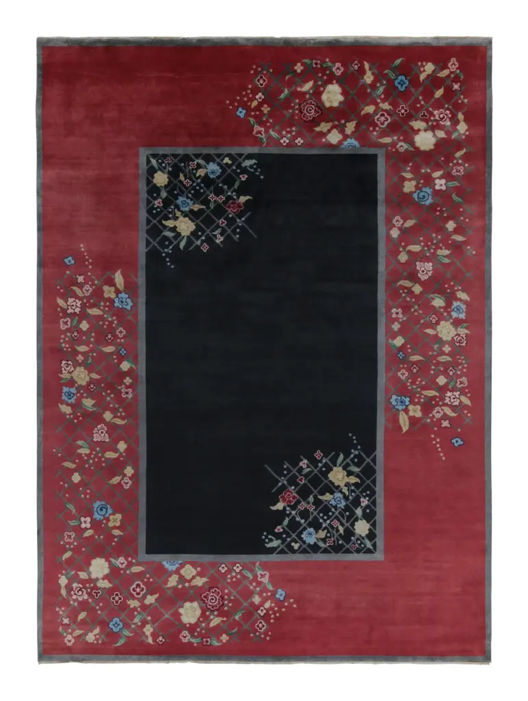 Looking for a custom size? For more information on customization capabilities, please reach out to custom@chairish.com. A 12x15 Art Deco rug, inspired by Chinese sensibilities of the 1920s, from Rug & Kilim’s inspired new Deco Collection. Hand-knotted in wool. Further On the Design: A deep red border marries a bold black field, both enjoying the sheen of this fabulous blend of yarns for a lustrous, healthy pile. Bright yellow, blue, and lighter red hues decorate the floral patterns, and sit gorgeous against the darker hues. A regal yet versatile contribution to the Chinese Deco style, and an exemplar of graceful presence. Further enjoys pristine condition as a new rug, and spacious large size seldom-seen in this style. Care Instructions: Dust and vacuum regularly. In case of spill, mix clear shampoo with dish soap in warm/hot water for best spot removal.