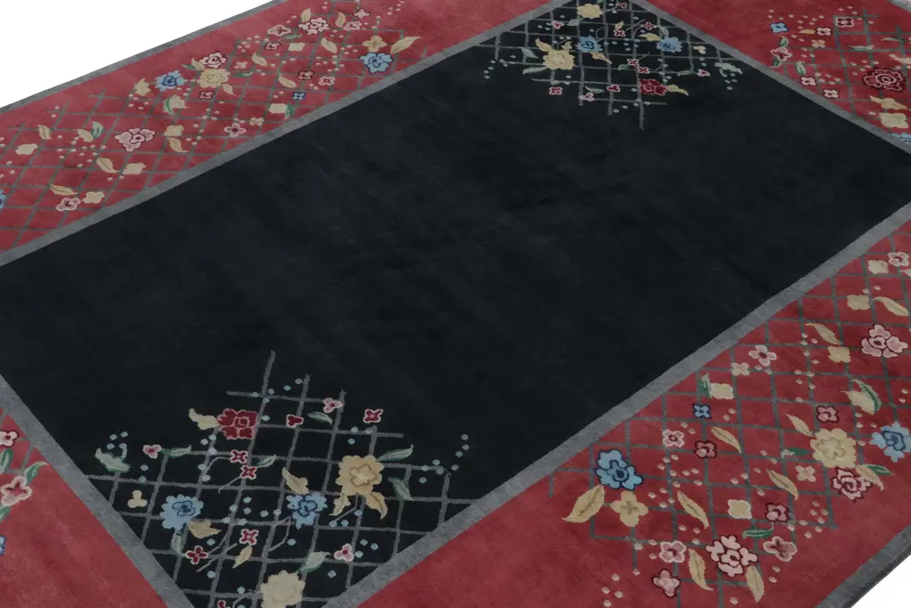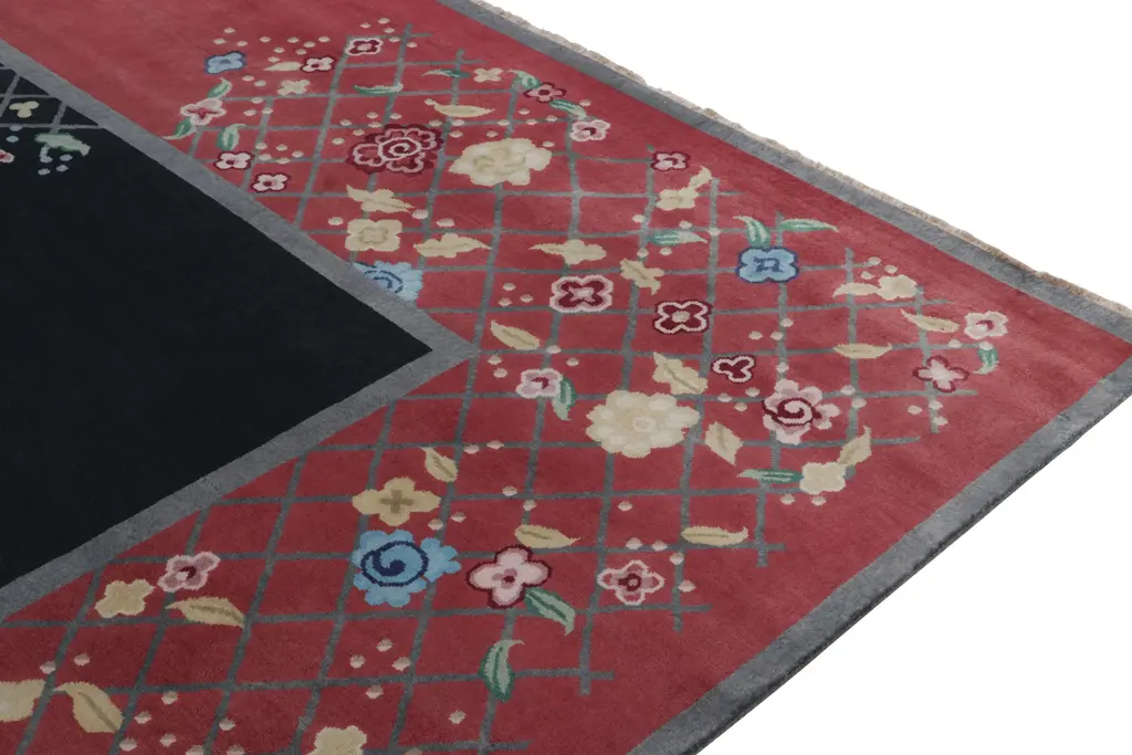Rug & Kilim Chinese Style Art Deco Rug In Black & Red With Colorful Florals - 12'x15'