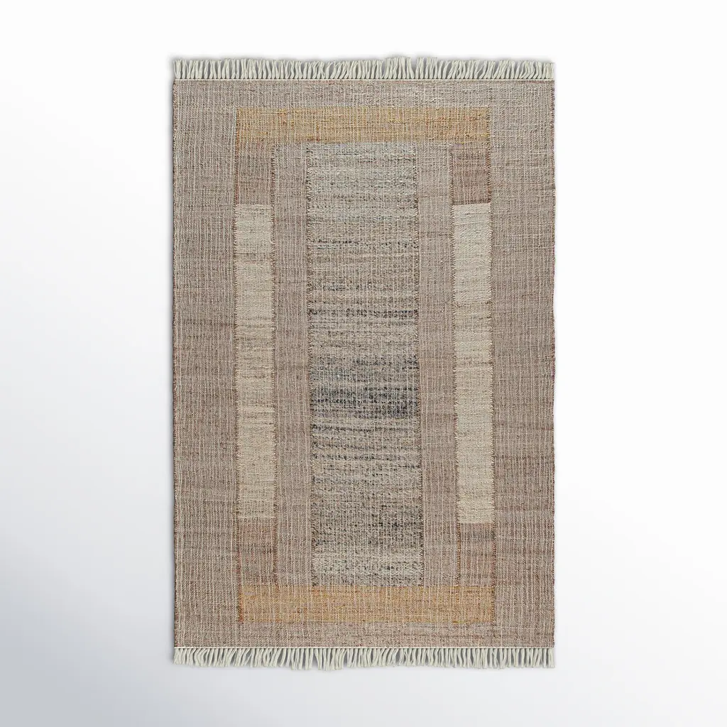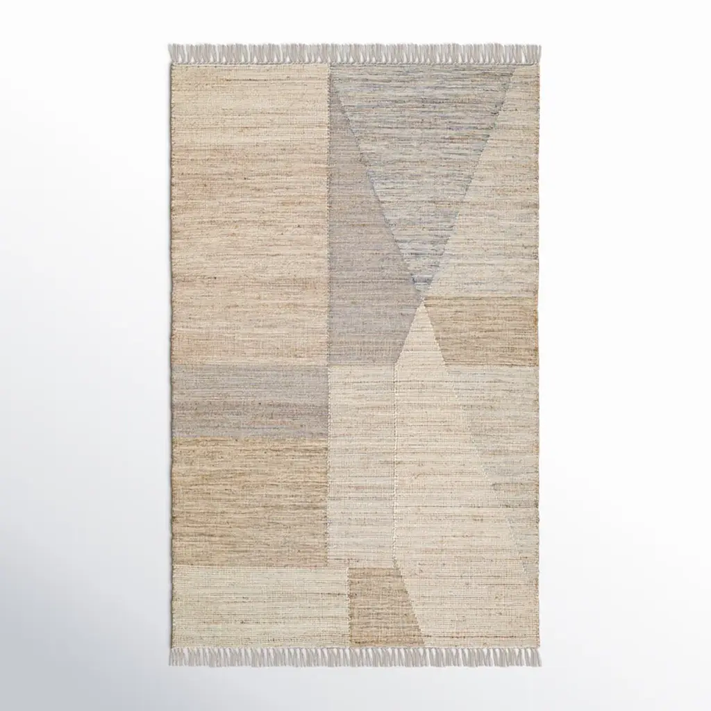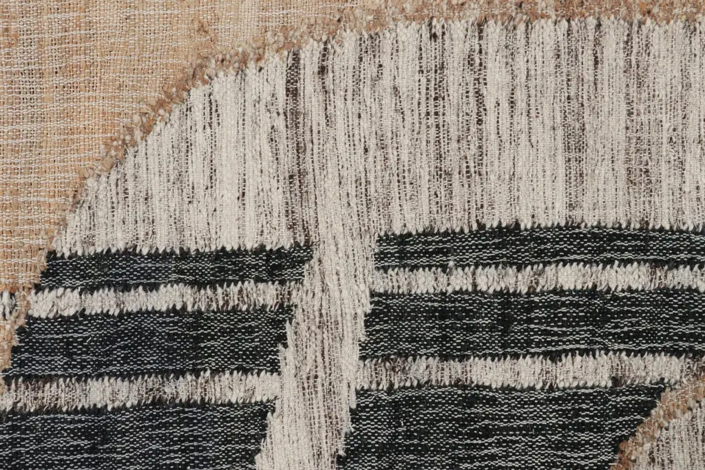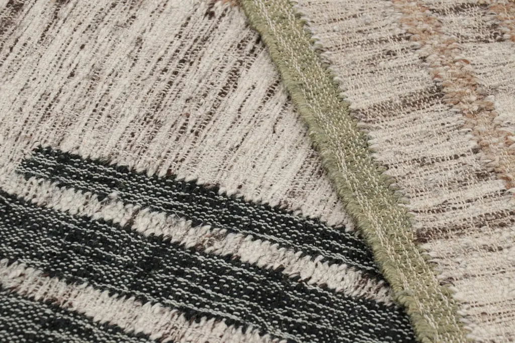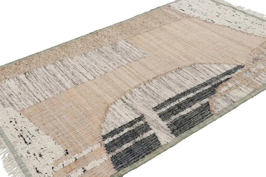 Made with handwoven wool and jute, this 5x8 flatweave represents an exciting new custom-capable line in the Rug & Kilim Collection. On the Design: This contemporary rug features an immersive geometric design wherein beige-brown, black, and cream hues are used to create compelling abstract patterns—where ribbed elements emerge and recede against striated planes. Admirers of the craft and keen eyes will also note a play of several flatweave textures which are adorned in natural hues of the subtle colorway. The construction, too, is a natural choice for eco-conscious designers seeking a sustainable, yet also durable choice. This piece is a green-friendly weave with an expressive, yet comfortable beauty in its use of earth tones and refreshing colors.Custom Capable: All sizes and colors available—inquire for a quote.