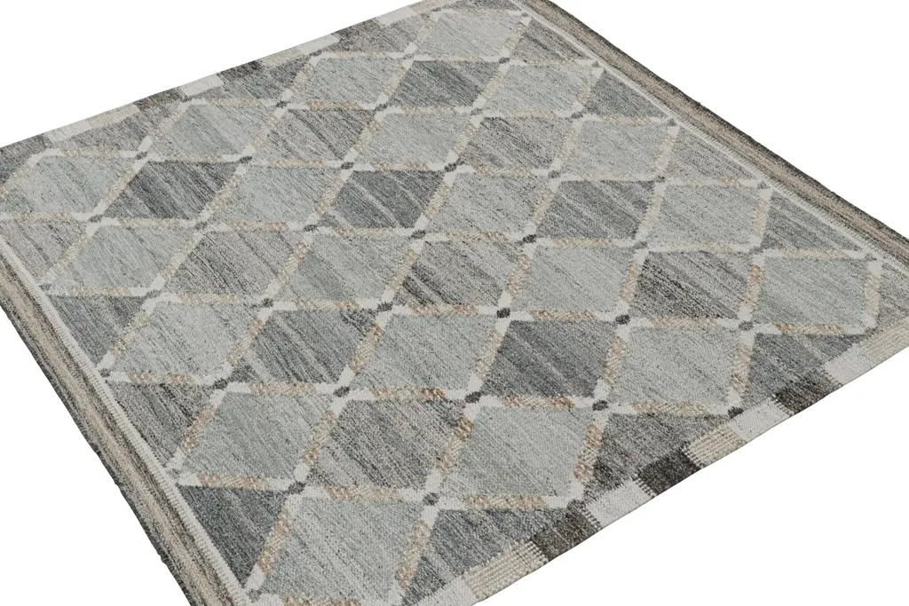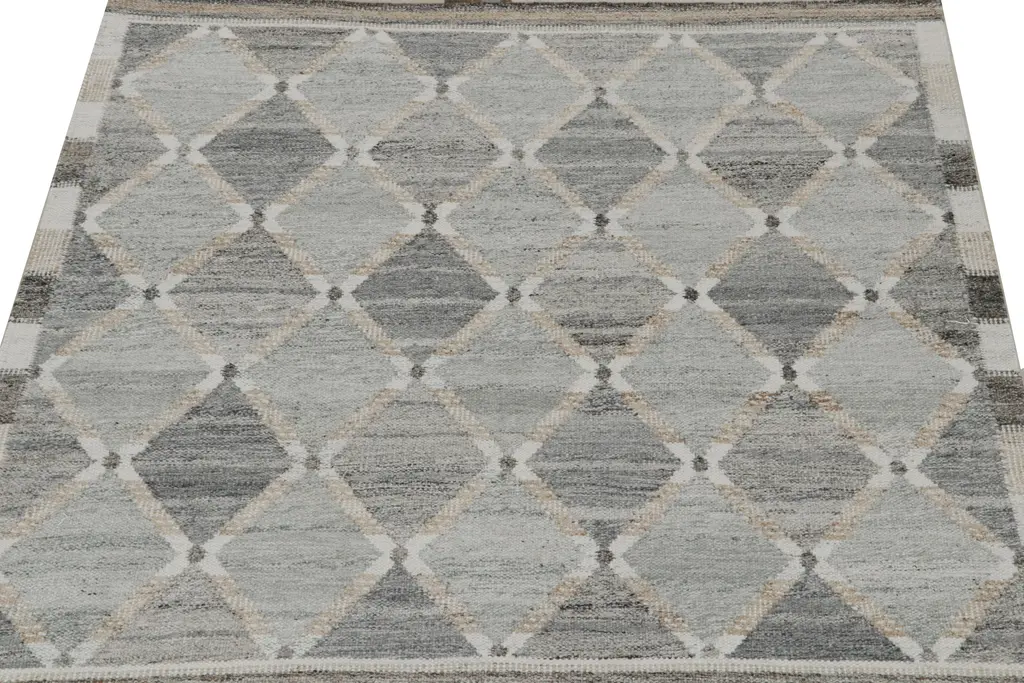 Looking for a custom size? For more information on customization capabilities, please reach out to custom@chairish.com. This custom flat weave design is a new addition to the Indoor-Outdoor rug line of Rug & Kilim’s Scandinavian Kilim collection. Further On the Design: These photos represent a former 5×7 Kilim in this construction, handwoven in our blend of performance yarns with exterior design in mind. This particular design enjoys a natural, comfortable sense of movement with repeating diamond lattice patterns in gray and white salt-and-pepper tones. Its cozy neutrals and durable construction are the ideal choice in spaces like patios, mudrooms, and similar areas among its vast applications. This modern flat weave further exemplifies our reputed, heavier body with buckle resistance and greater durability against foot traffic. A comfortable, sophisticated contribution to the Swedish Deco aesthetic.