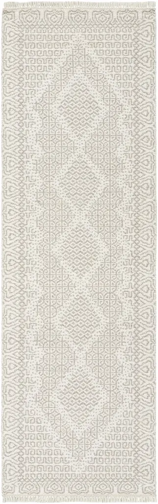 Collection: Rumi Colors: Beige, MediumGray Construction: Hand Woven Material: 100% Wool Pile: No Pile Styles: Transitional,Traditional Made In: India Thickness: 0.4" Fringe Length: 2" Price Range: $$$$$ (Affordable)