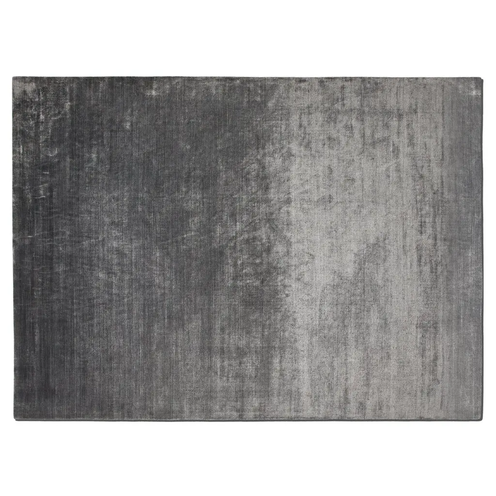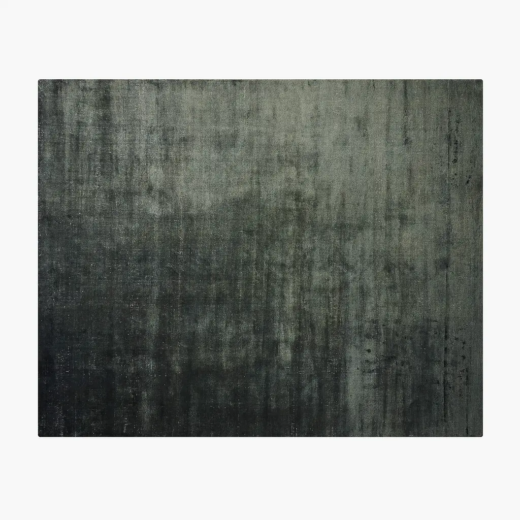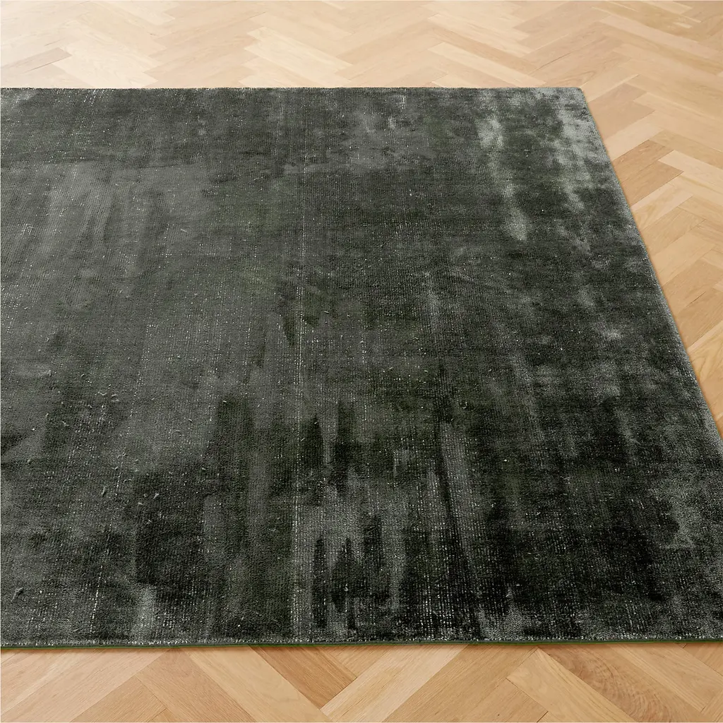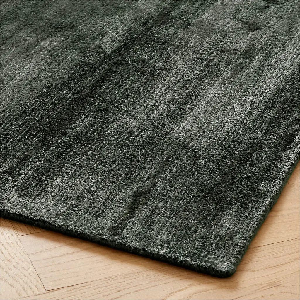 Muted dark teal viscose rug echoes the soft hand and luster of a silky velvet with visible ivory warp yarns underneath. Composed of a combination of looped and cut viscose, the handloomed pile takes on tonal highs and lows as the light changes throughout the day. CB2 exclusive. How will it look in your room? 12"x12" rug samples are available in stores for a fee refundable upon return of the sample.