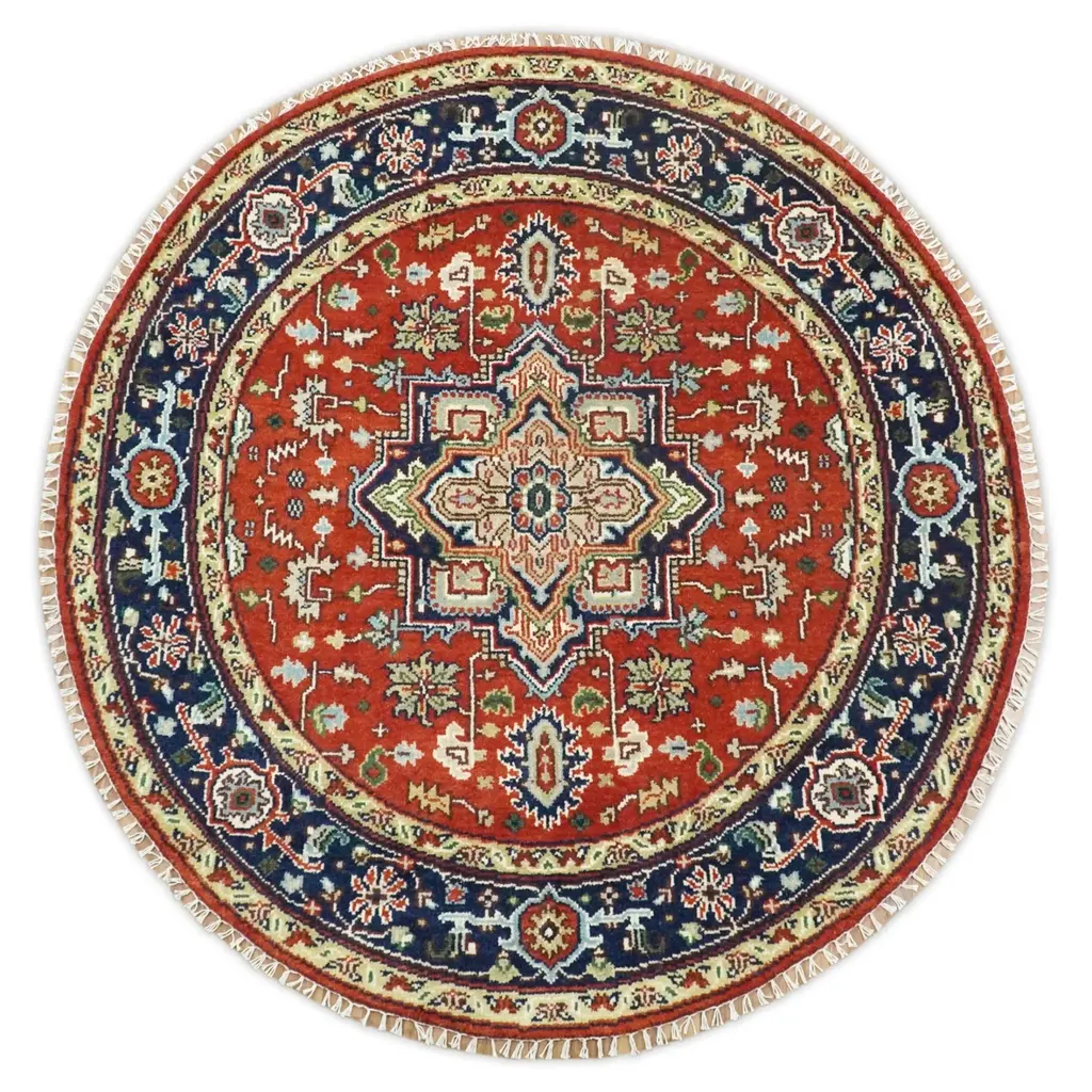 This Rust and Blue Hand Knotted Traditional Heriz Serapi Multi Size wool Area Rug is skillfully crafted to create a beautiful and durable addition to any room. Made of high quality wool, its intricate design adds a touch of elegance and warmth to your space. Transform your home with this timeless rug. Hand-Knotted Made with Wool Color: Red and Blue Made with 22 knots per square inch All sizes are made to order in 30-60 days Hand Knotted rugs have been made for centuries and carry a tradition and art. This specific rug is made in India, in the city of Bhadohi. Bhadohi is one of the biggest rug manufacturing cities. Carpet weaving in the region dates back to the 16th century during the reign of Akbar. The skilled artisans of Bhadohi have been carrying the tradition of rug-making for centuries. USERS GUIDE Avoid prolonged moisture Vacuum regularly and shake to remove dust Do not pull any loose threads. Use scissors to cut the ends simply Blot spills immediately with a white cloth. Harsh chemicals may damage or fade the rug Use rug protectors under heavy furniture