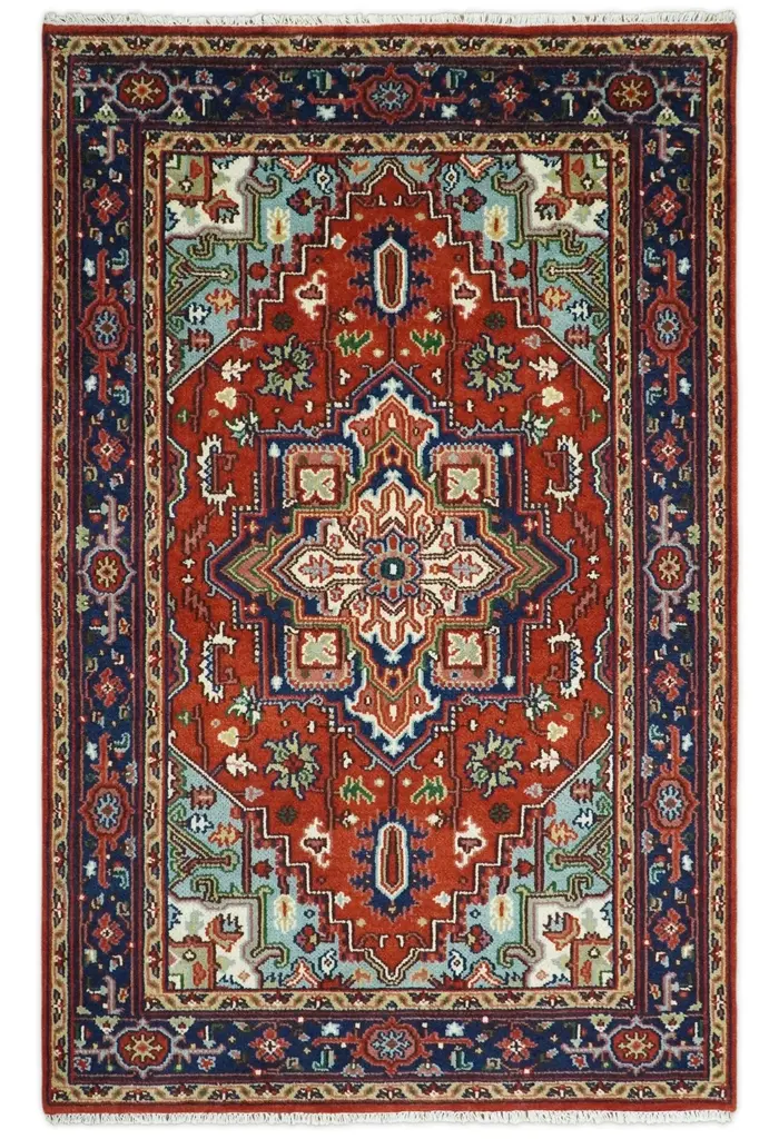 This Rust and Blue Hand Knotted Traditional Heriz Serapi Multi Size wool Area Rug is skillfully crafted to create a beautiful and durable addition to any room. Made of high quality wool, its intricate design adds a touch of elegance and warmth to your space. Transform your home with this timeless rug. Hand-Knotted Made with Wool Color: Red and Blue Made with 22 knots per square inch All sizes are made to order in 30-60 days Hand Knotted rugs have been made for centuries and carry a tradition and art. This specific rug is made in India, in the city of Bhadohi. Bhadohi is one of the biggest rug manufacturing cities. Carpet weaving in the region dates back to the 16th century during the reign of Akbar. The skilled artisans of Bhadohi have been carrying the tradition of rug-making for centuries. USERS GUIDE Avoid prolonged moisture Vacuum regularly and shake to remove dust Do not pull any loose threads. Use scissors to cut the ends simply Blot spills immediately with a white cloth. Harsh chemicals may damage or fade the rug Use rug protectors under heavy furniture